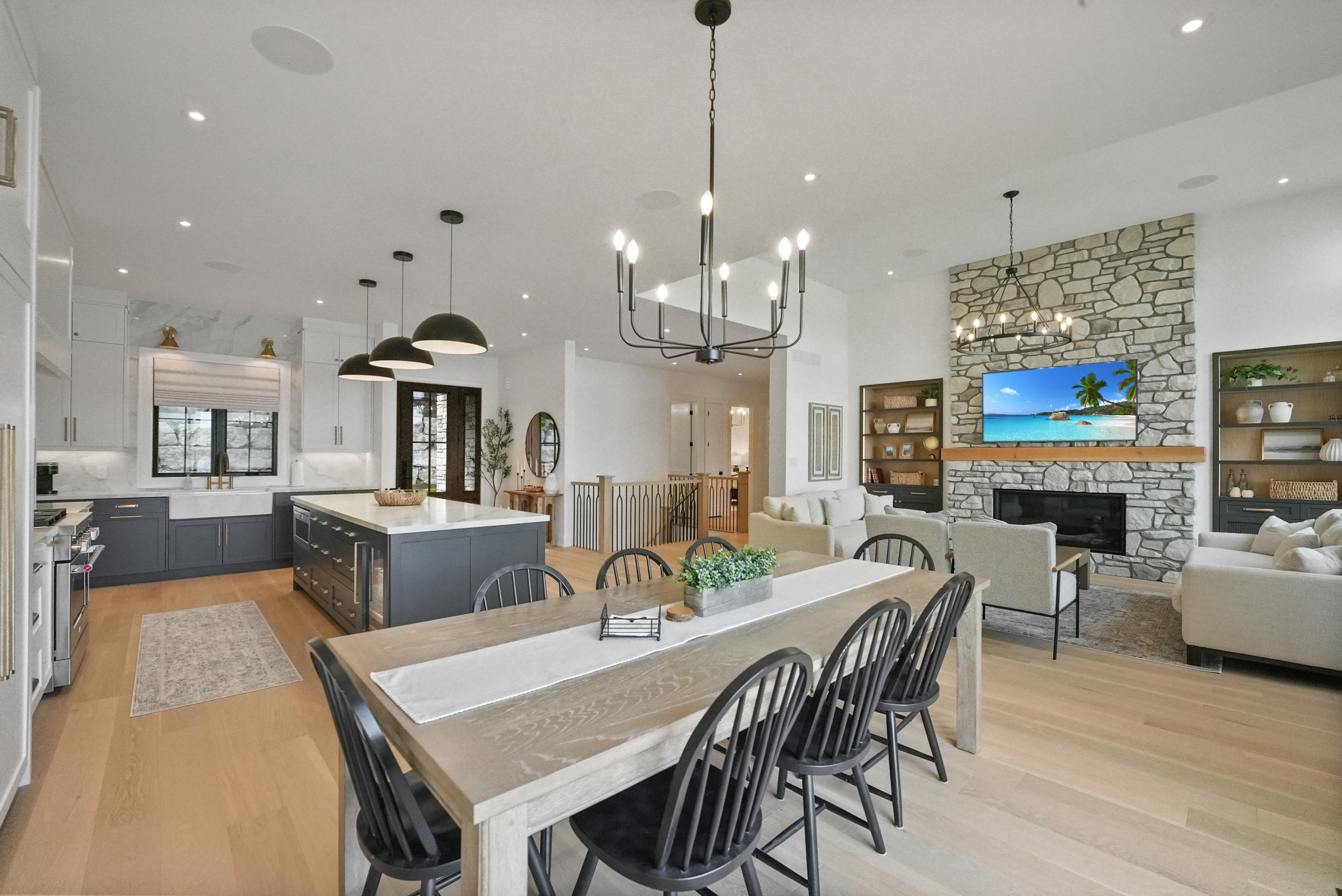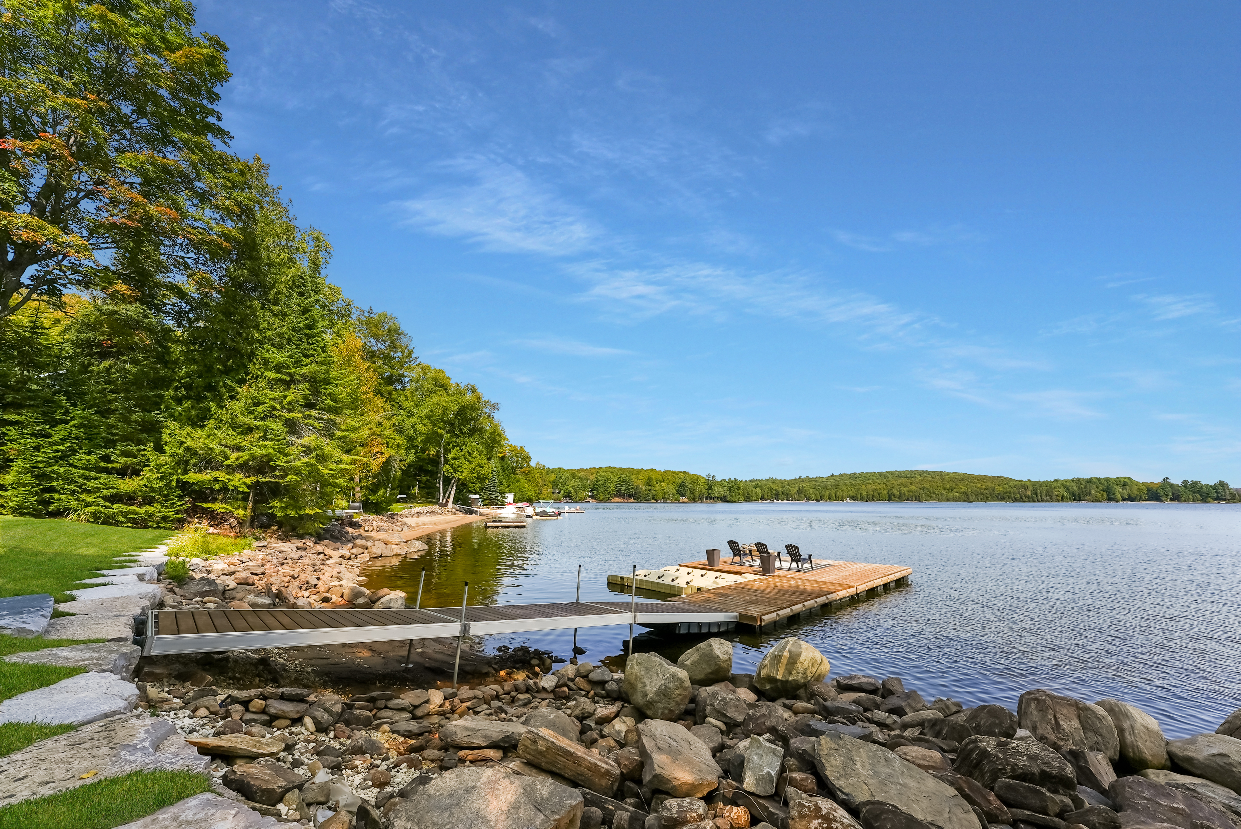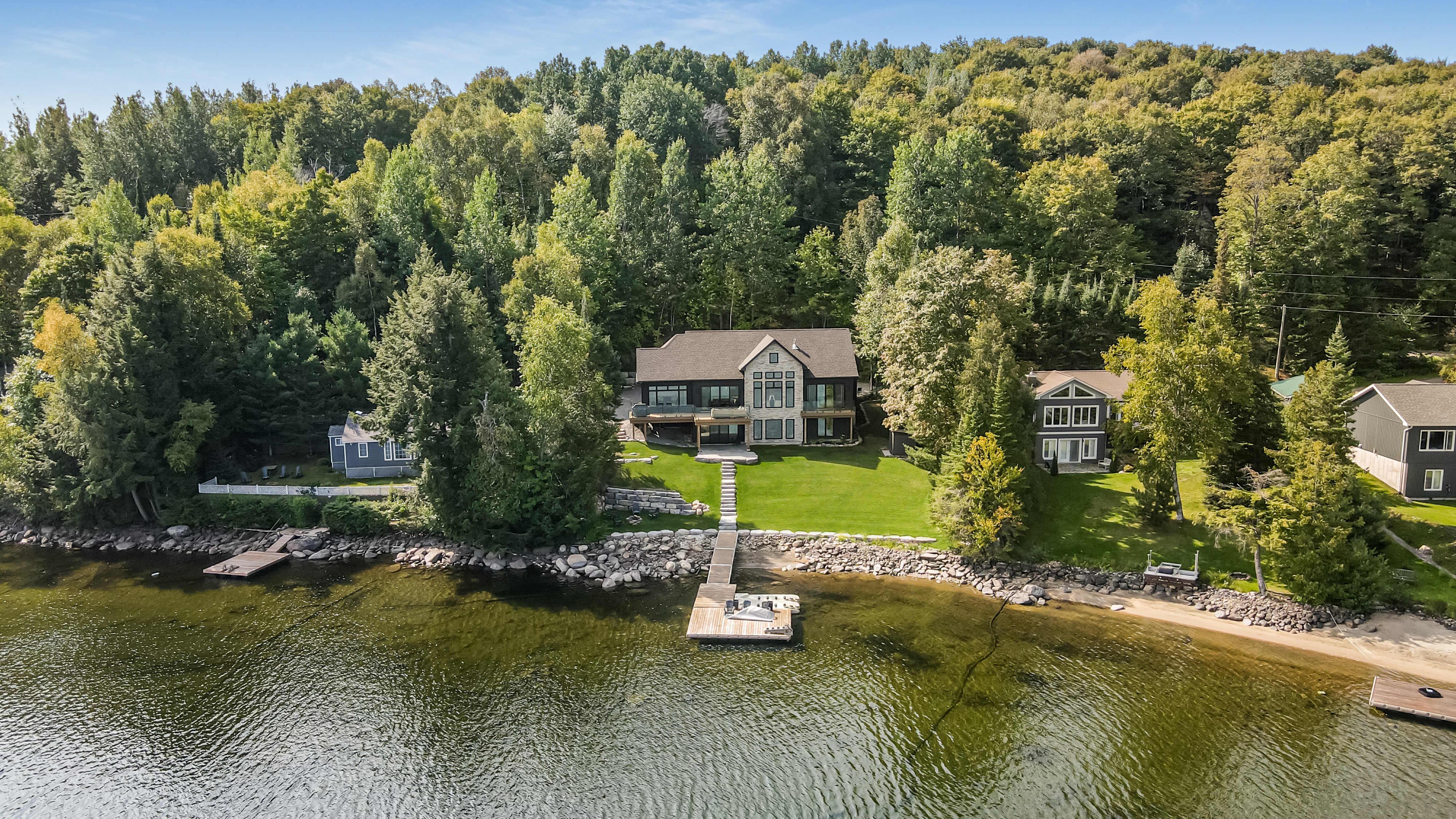 The main level features a soaring cathedral great room with a propane fireplace and a composite deck with glass railing that overlooks the expansive, clear lake. Walking through the door the view will take your breath away, as will the kitchen - boasting high-end appliances and extensive custom cabinetry that extends into a practical mudroom with laundry. In addition to the open concept main areas, You'll find four spacious bedrooms and three elegant bathrooms, plus an office and a fantastic sunroom for those lazy afternoons.
