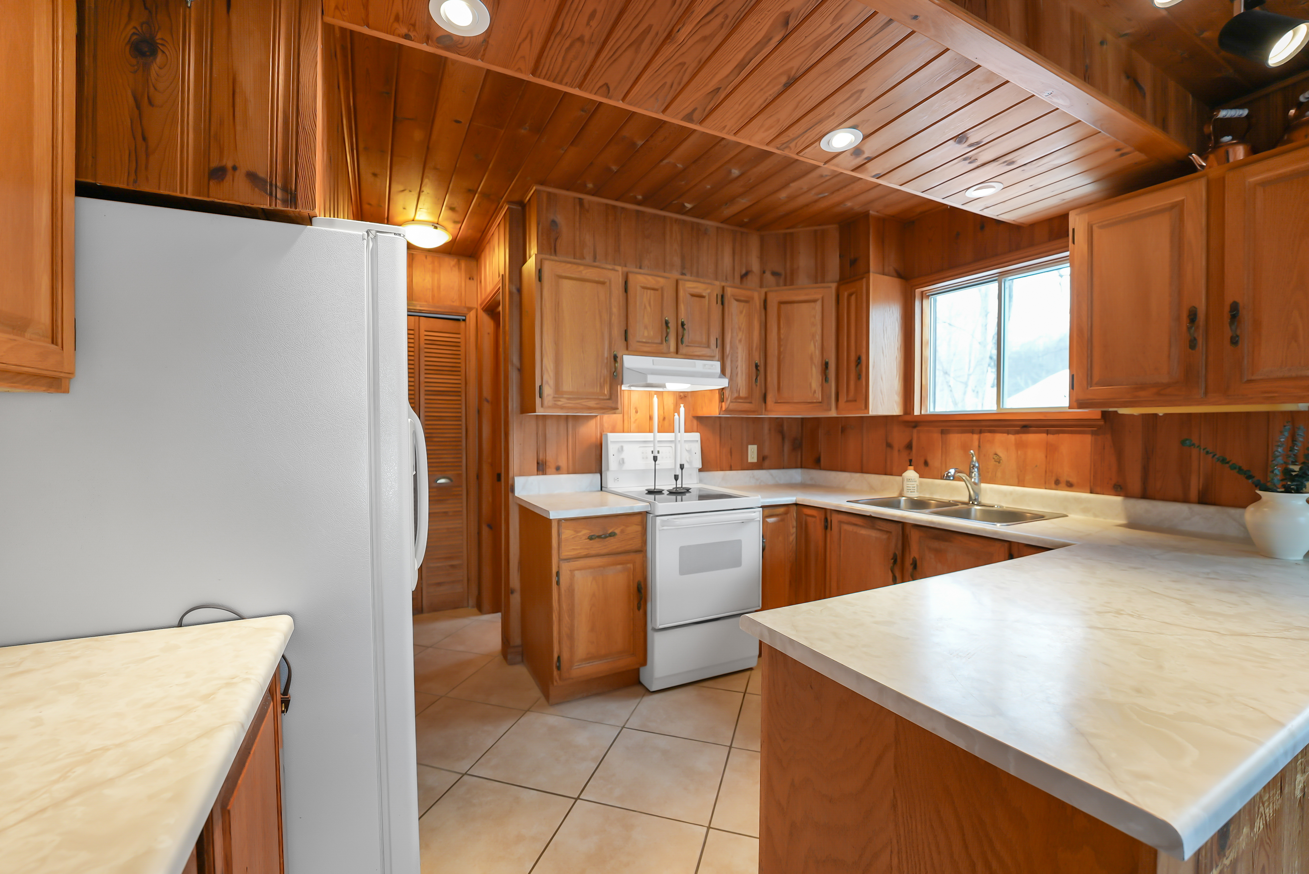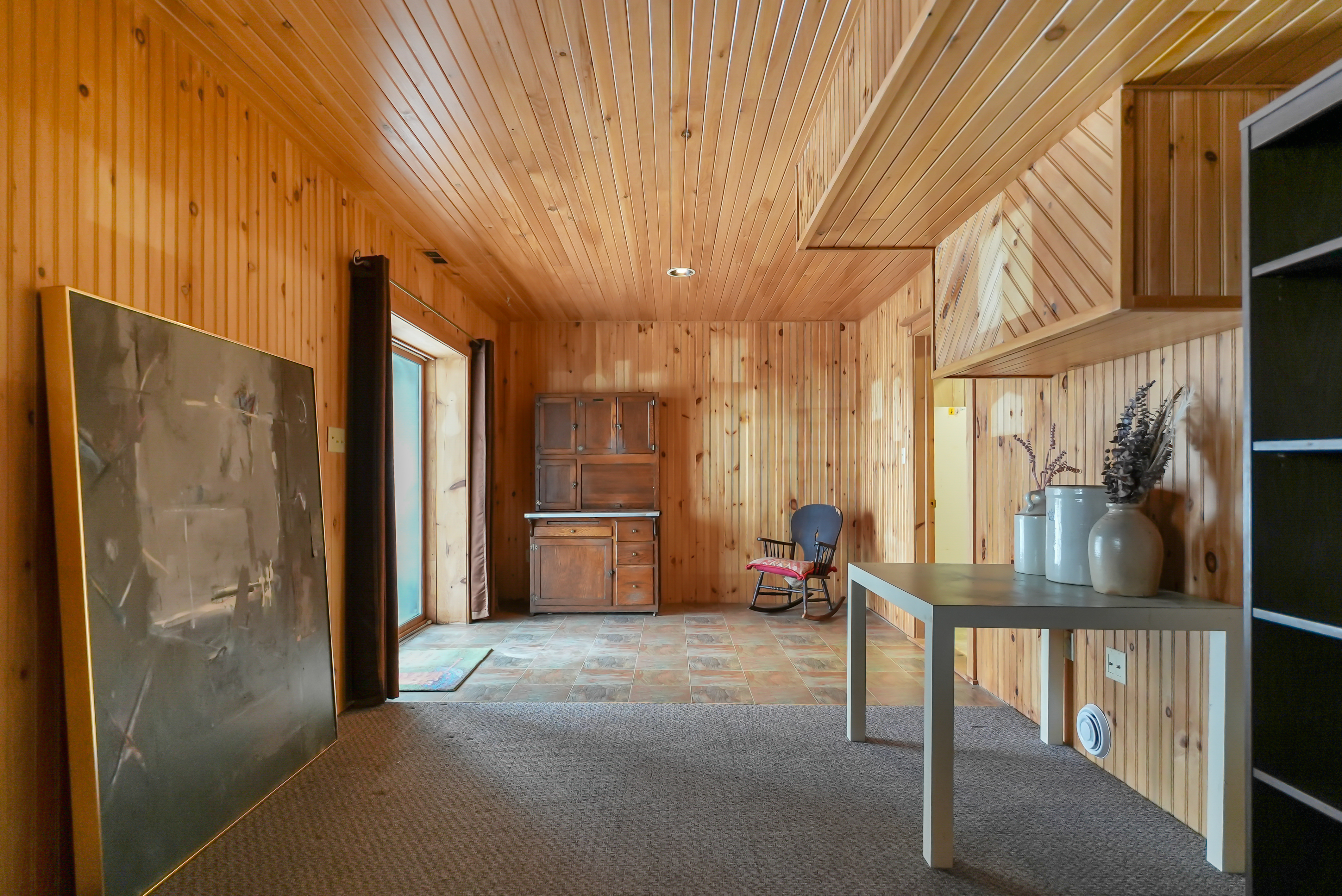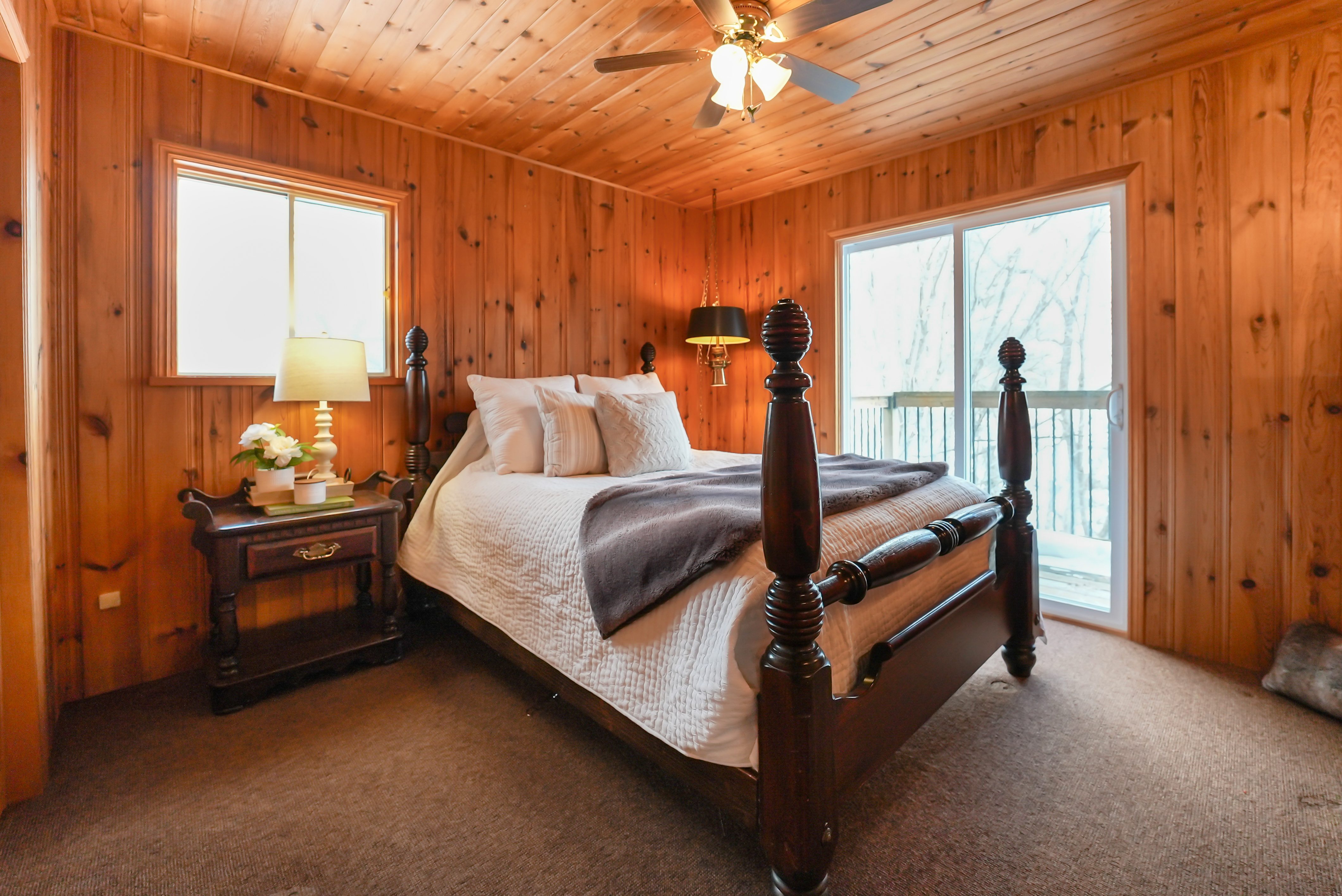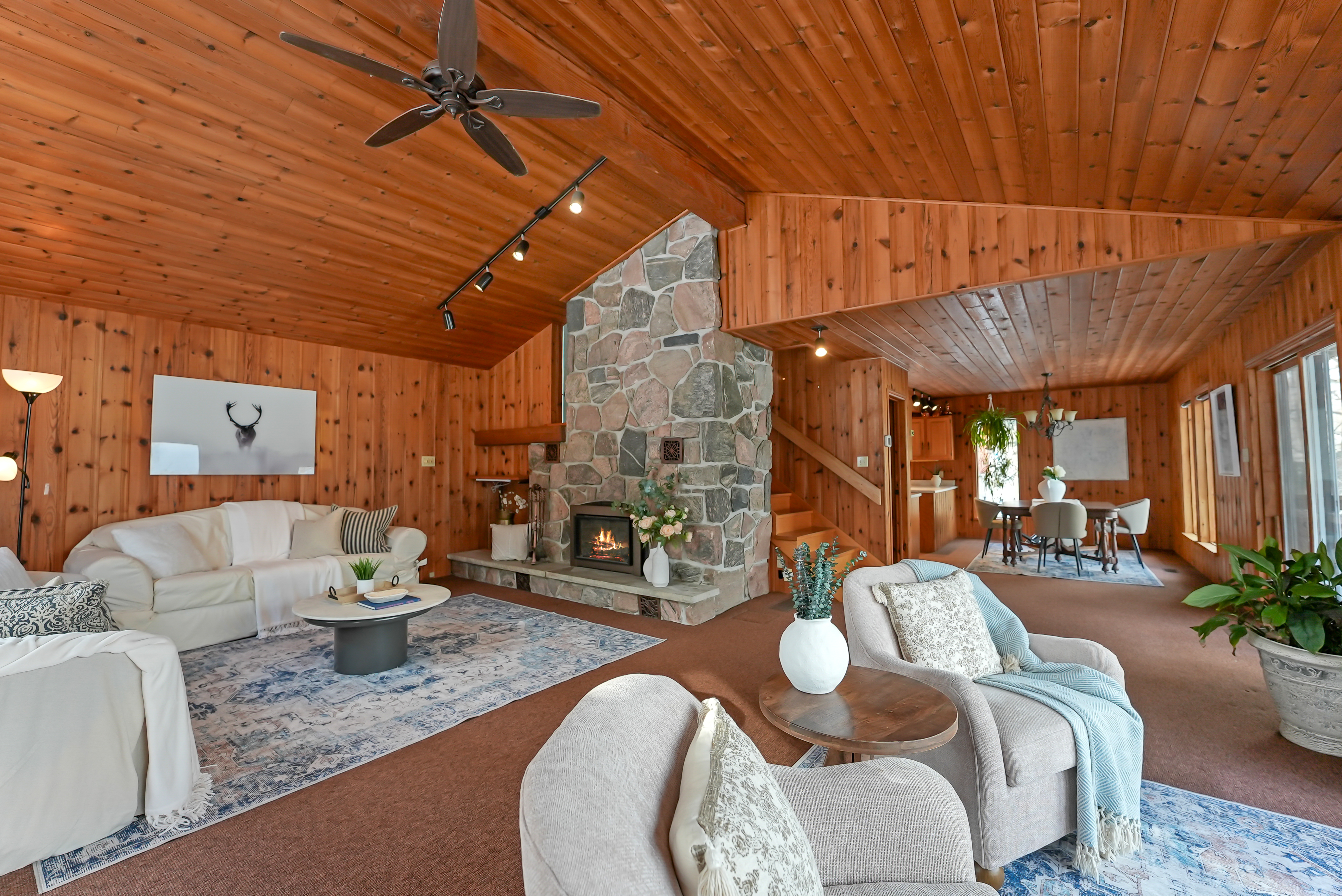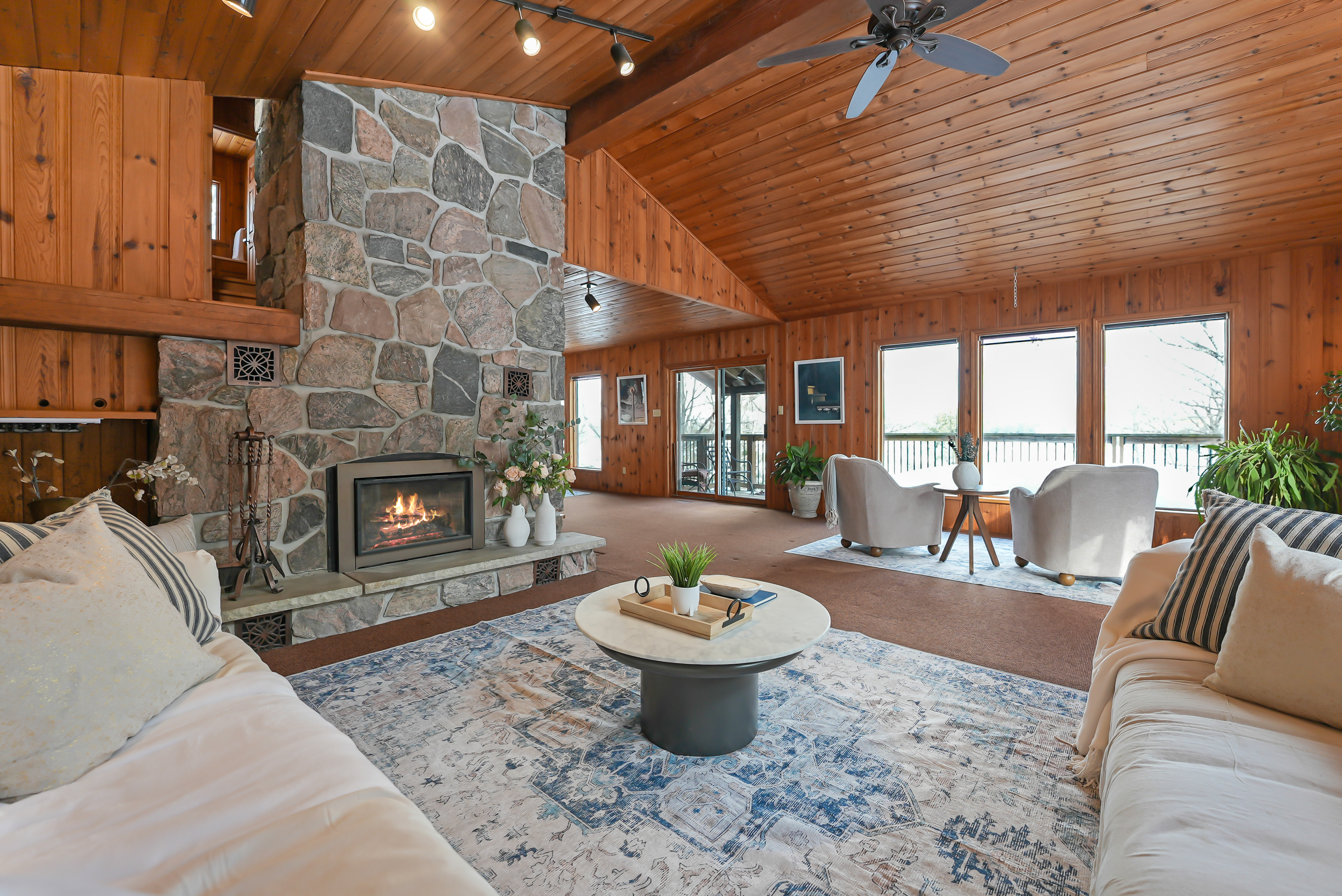 The home features a cathedral ceiling great room with a floor-to-ceiling granite stone fireplace and a convenient propane insert, leading out to a spacious lakeside deck. Located on a year-round road, halfway between Minden and Haliburton, this property is perfect for four-season living or as a cottage retreat.