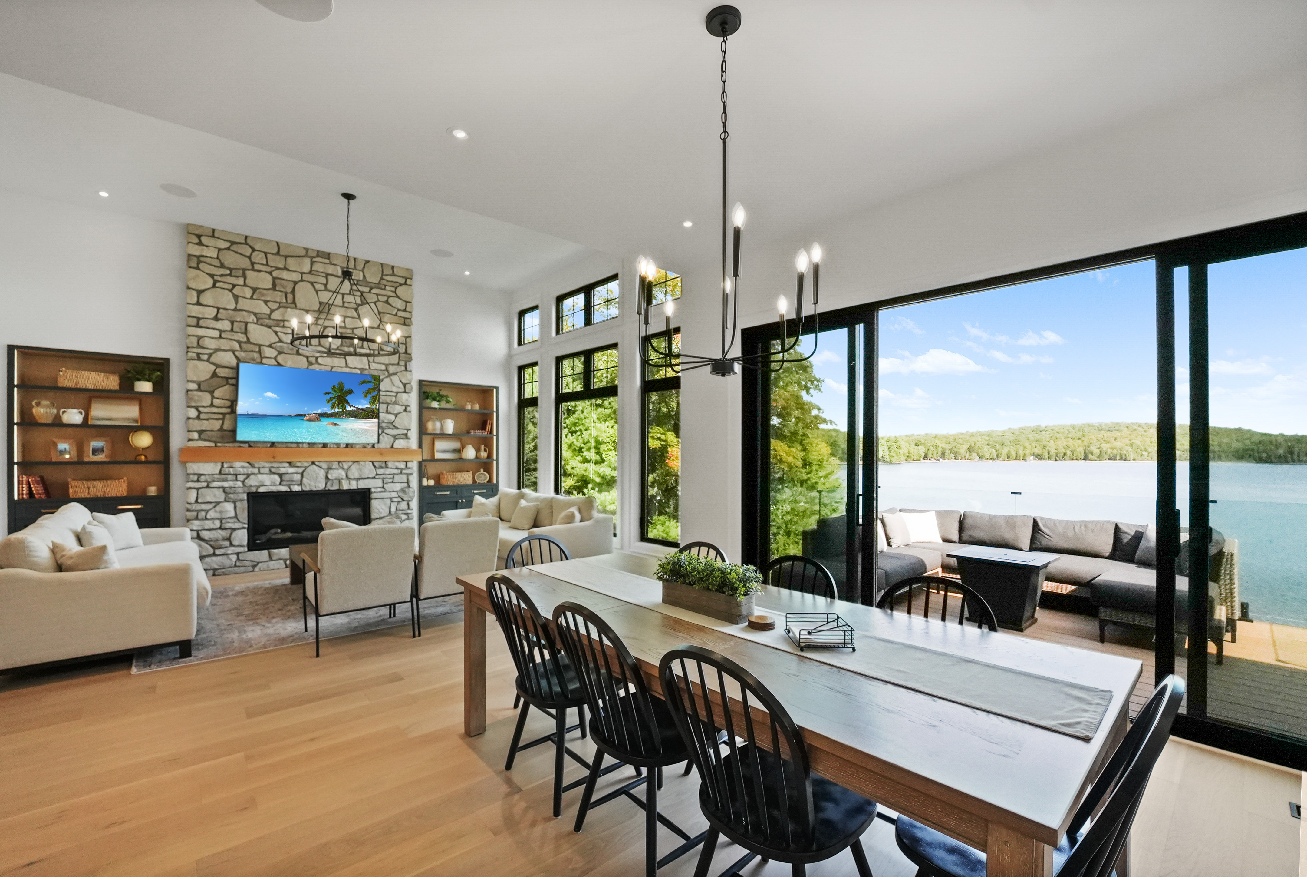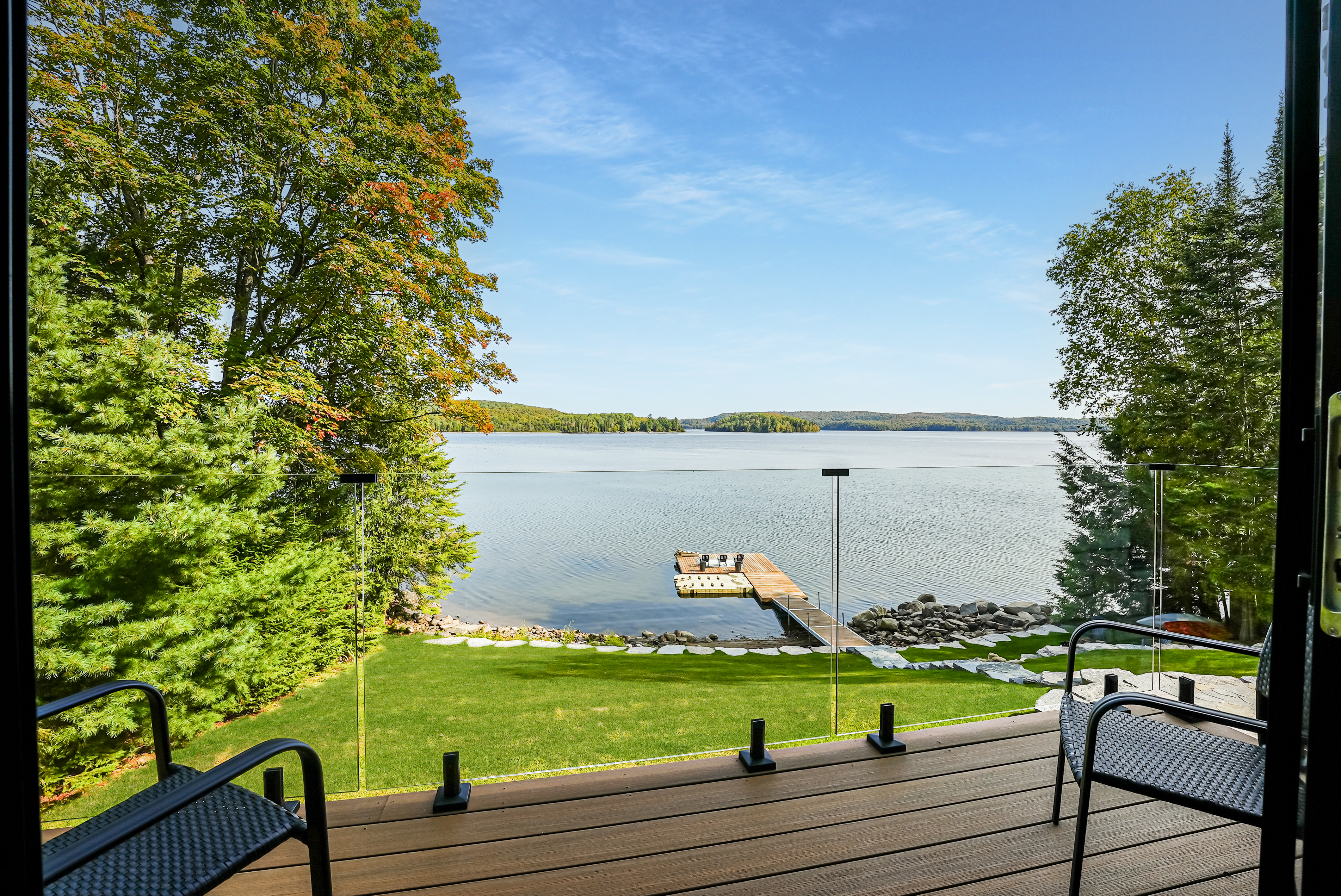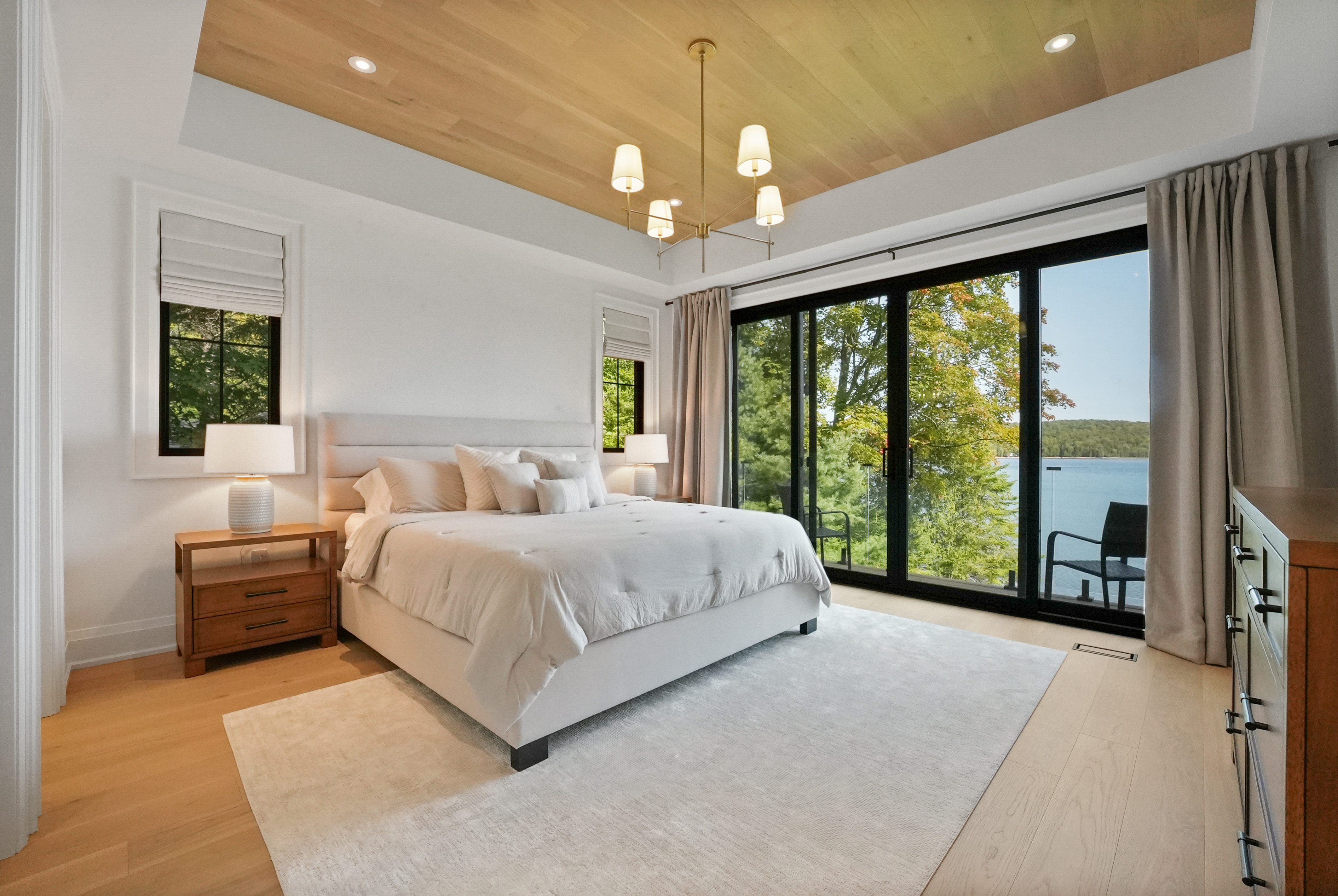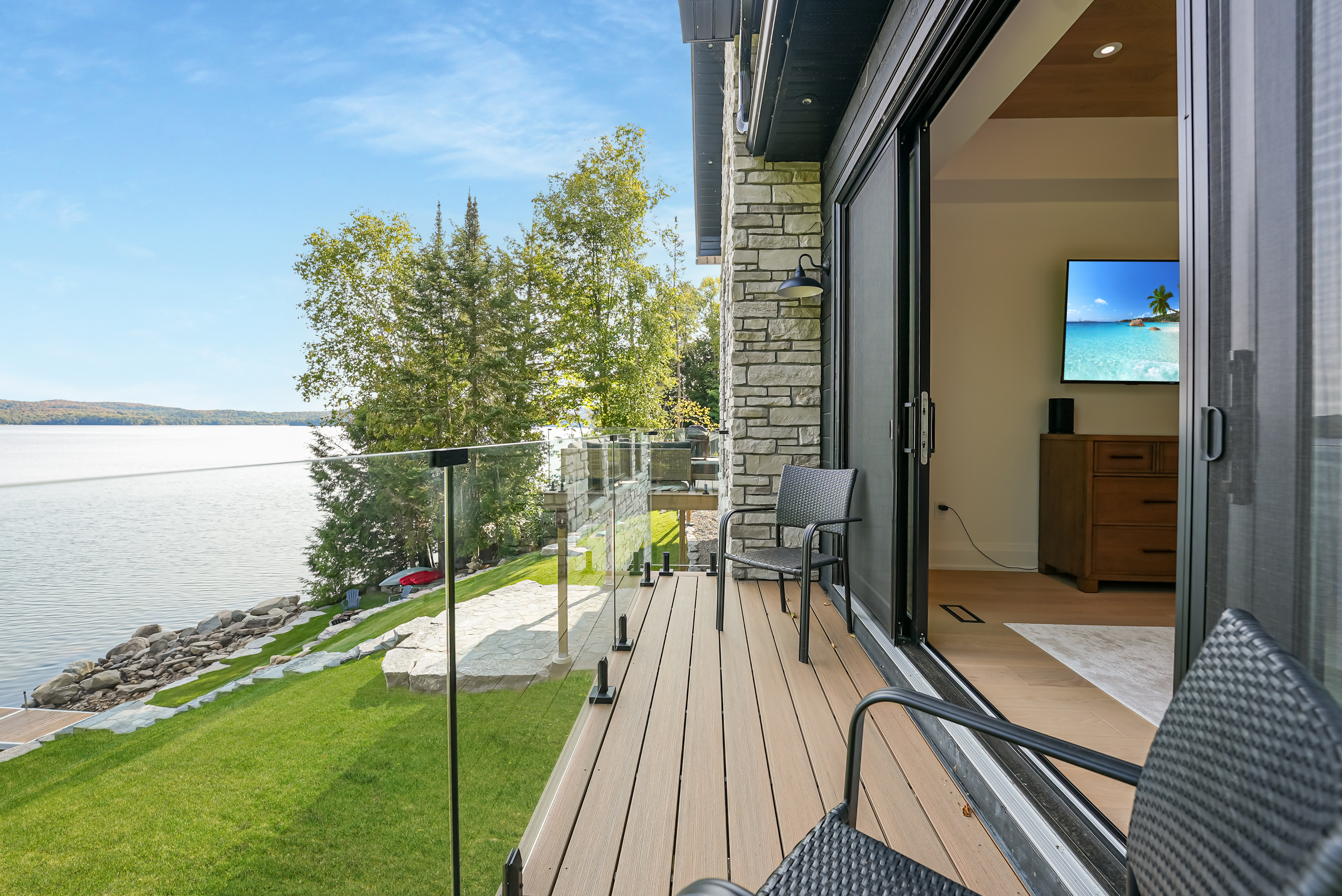 The main level features a soaring cathedral great room with a propane fireplace and a composite deck with glass railing that overlooks the expansive, clear lake. Walking through the door the view will take your breath away, as will the kitchen - boasting high-end appliances and extensive custom cabinetry that extends into a practical mudroom with laundry. In addition to the open concept main areas, You'll find four spacious bedrooms and three elegant bathrooms, plus an office and a fantastic sunroom for those lazy afternoons.