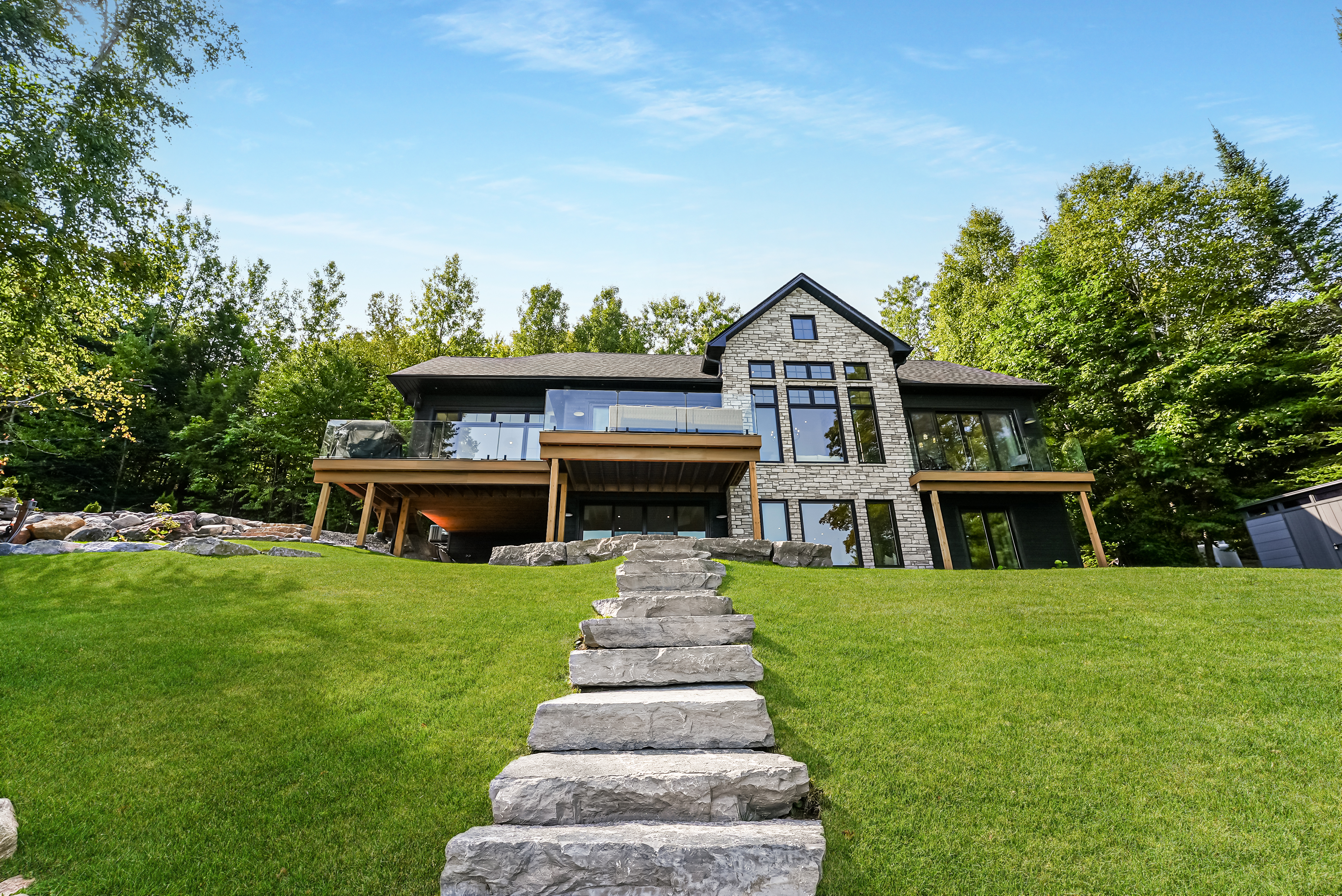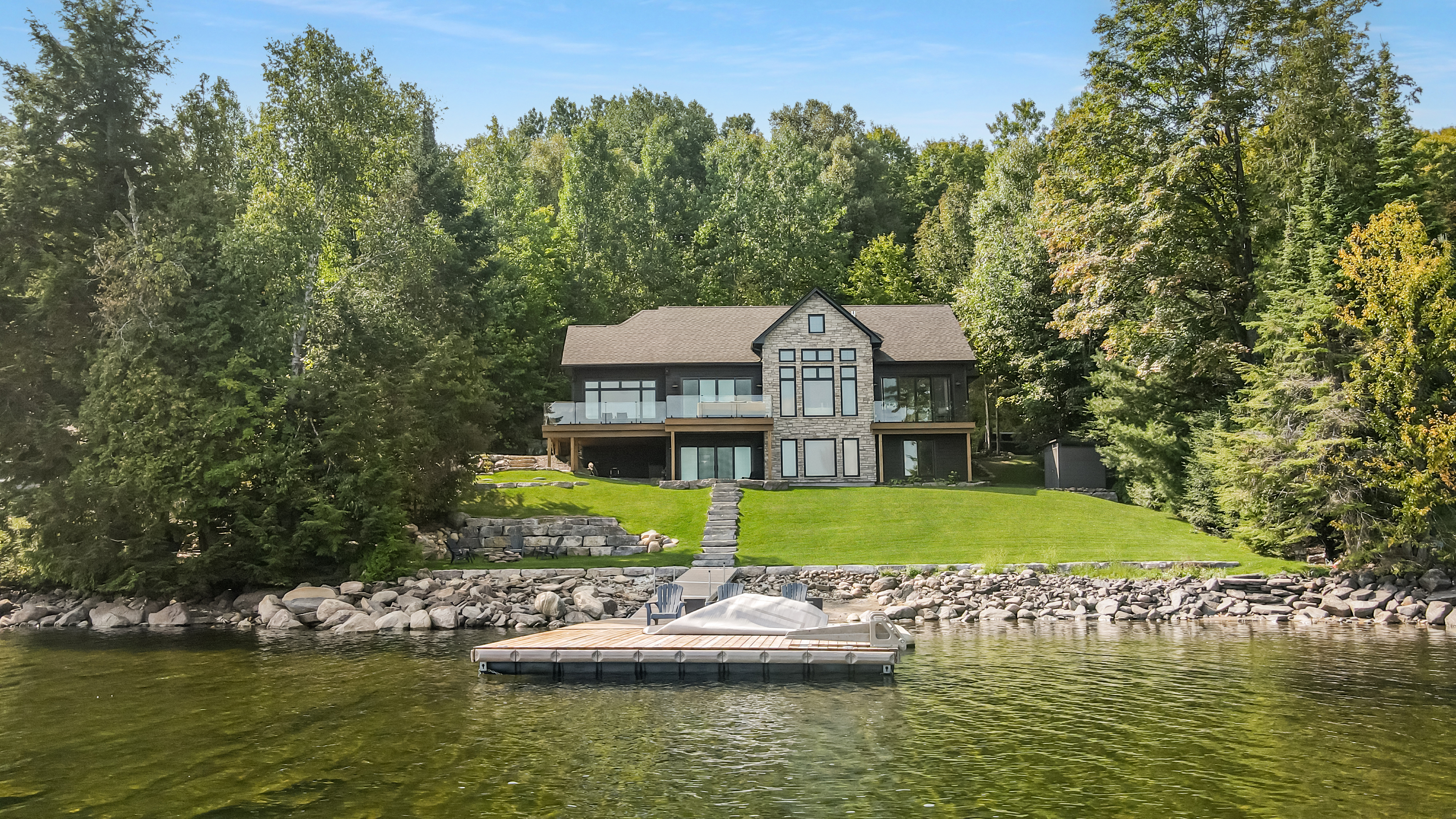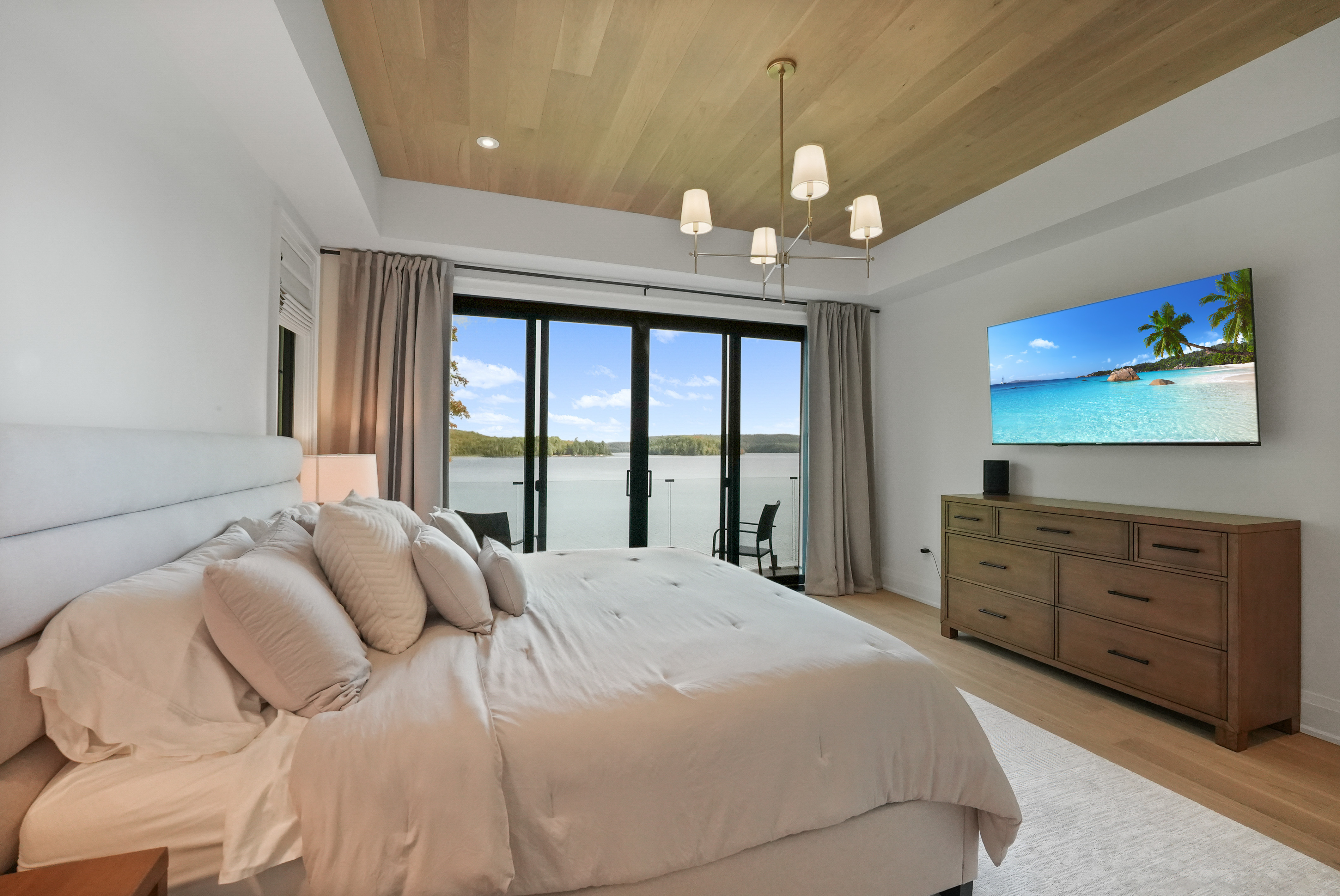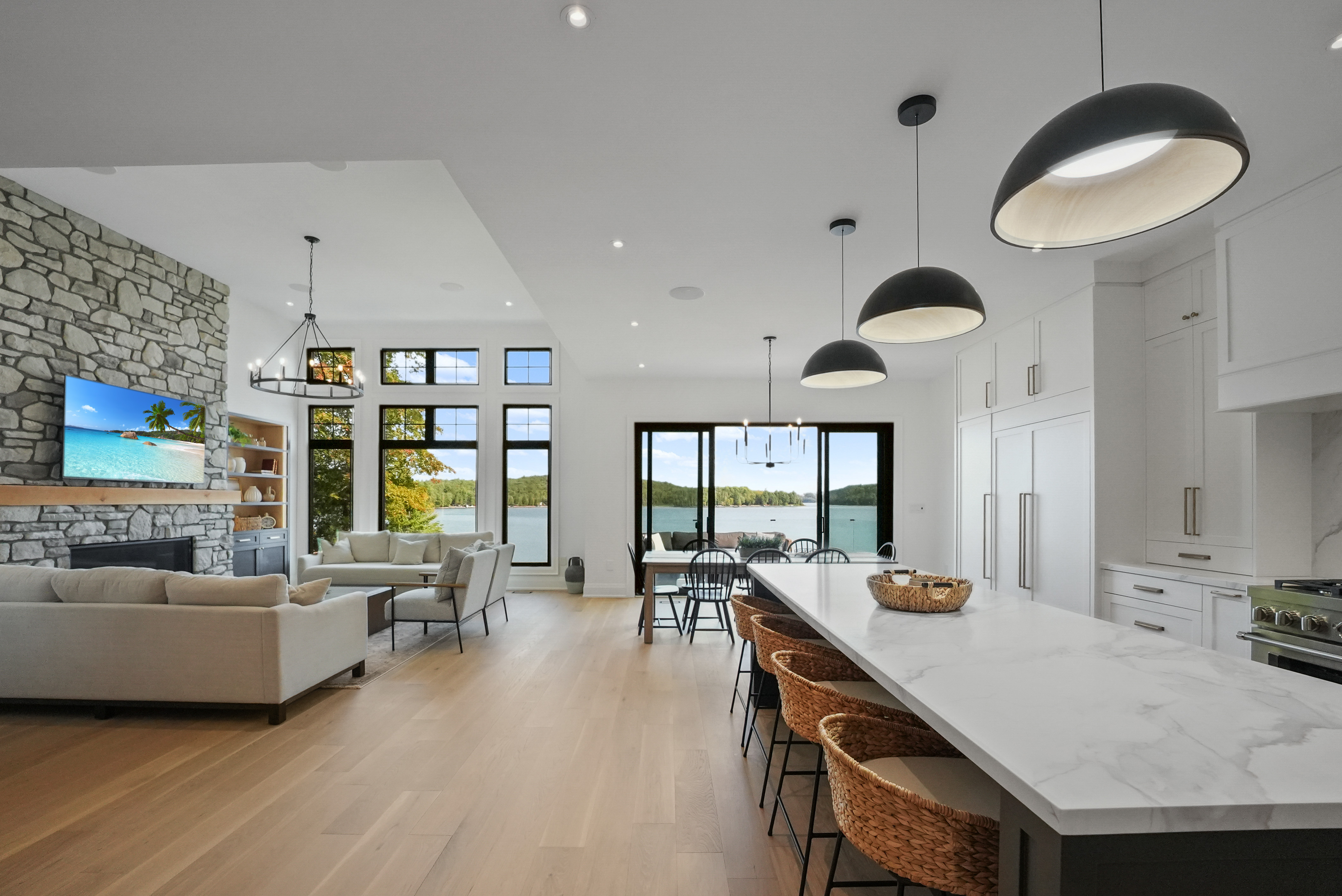 The main level features a soaring cathedral great room with a propane fireplace and a composite deck with glass railing that overlooks the expansive, clear lake. Walking through the door the view will take your breath away, as will the kitchen - boasting high-end appliances and extensive custom cabinetry that extends into a practical mudroom with laundry. In addition to the open concept main areas, You'll find four spacious bedrooms and three elegant bathrooms, plus an office and a fantastic sunroom for those lazy afternoons.
