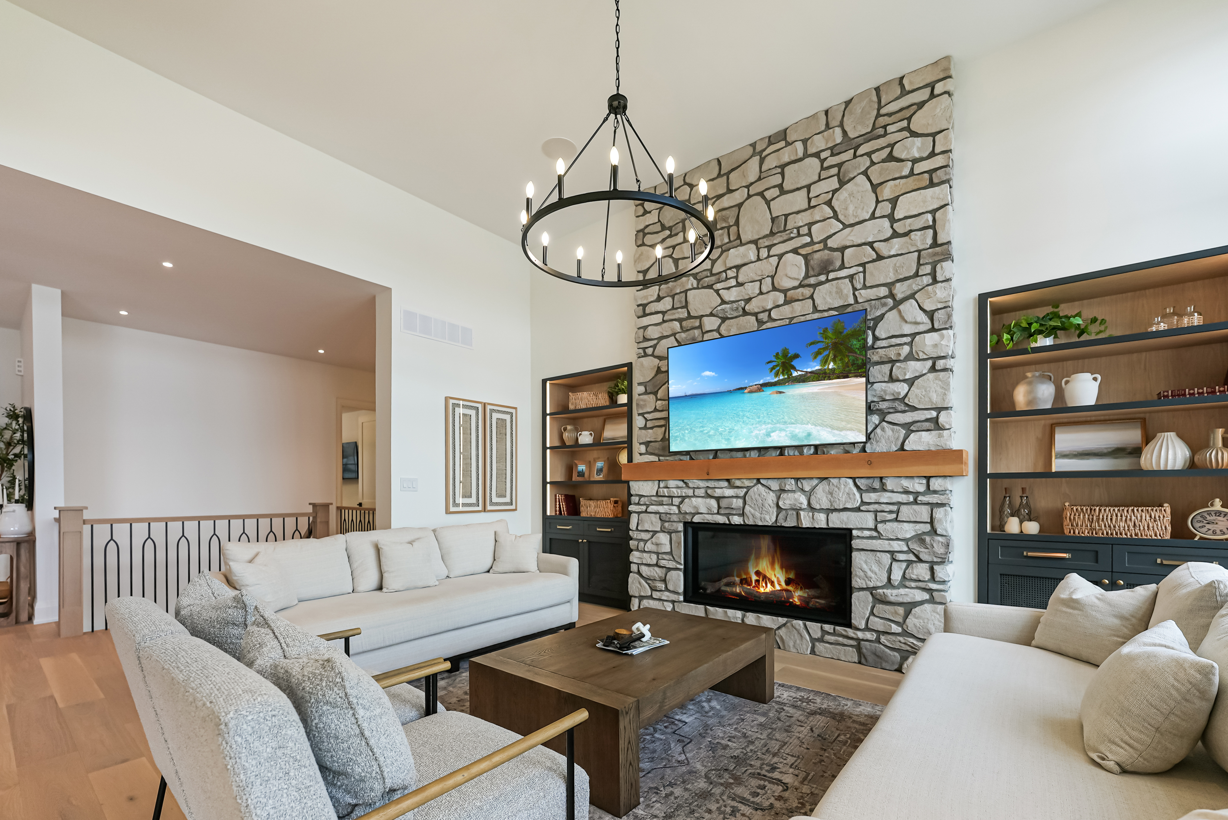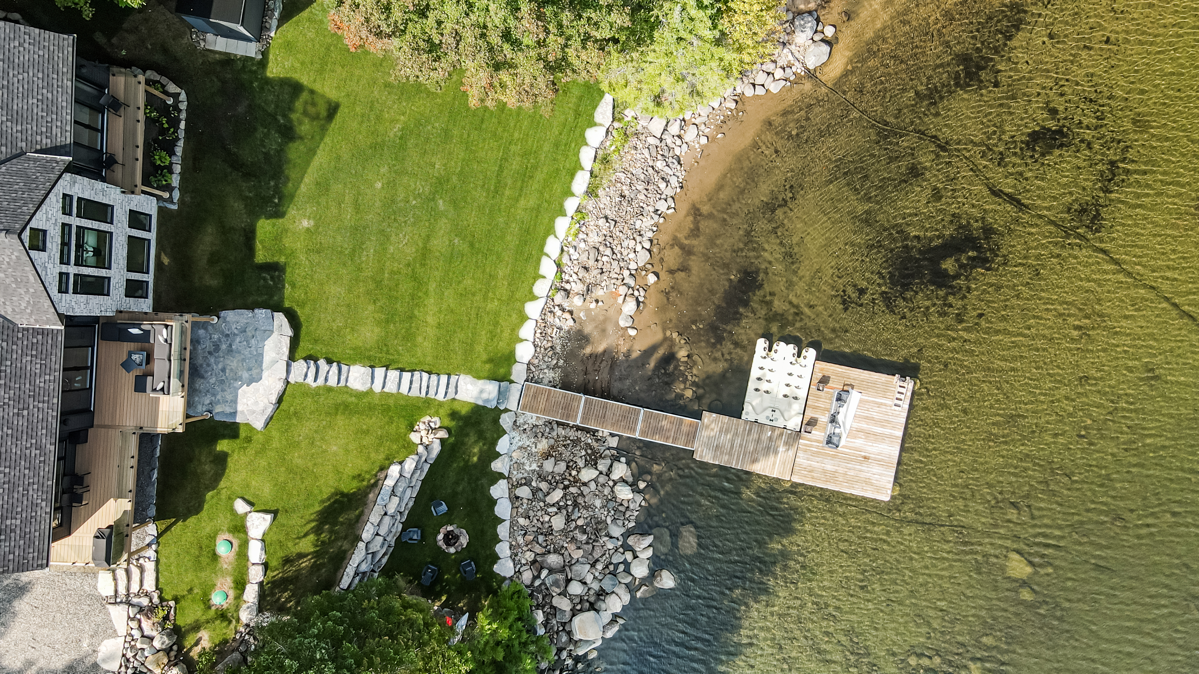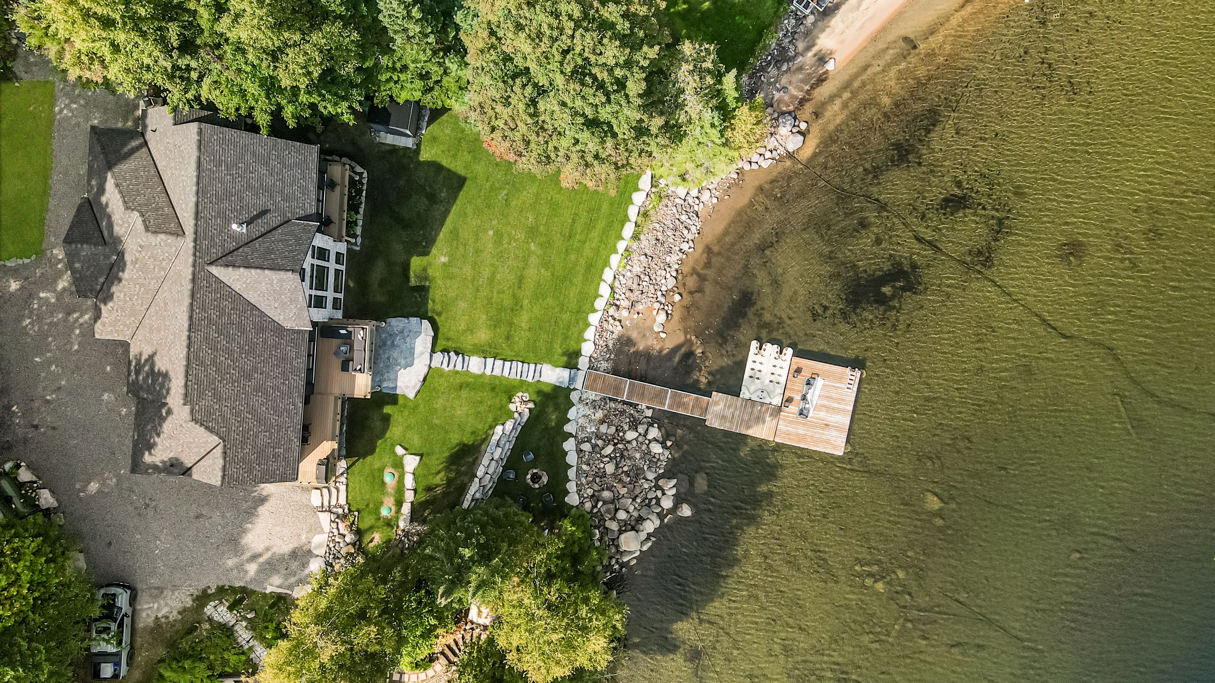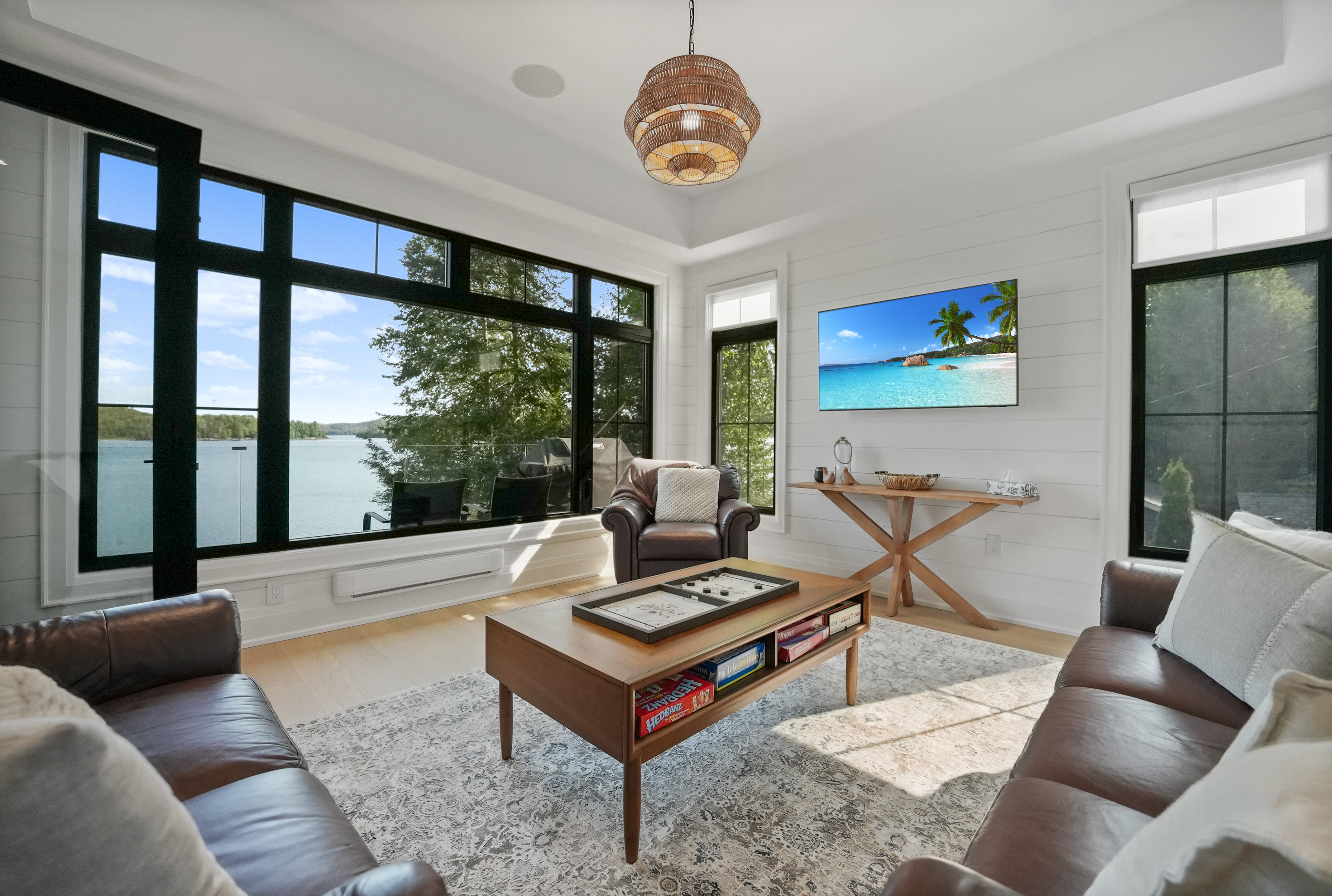 The main level features a soaring cathedral great room with a propane fireplace and a composite deck with glass railing that overlooks the expansive, clear lake. Walking through the door the view will take your breath away, as will the kitchen - boasting high-end appliances and extensive custom cabinetry that extends into a practical mudroom with laundry. In addition to the open concept main areas, You'll find four spacious bedrooms and three elegant bathrooms, plus an office and a fantastic sunroom for those lazy afternoons.