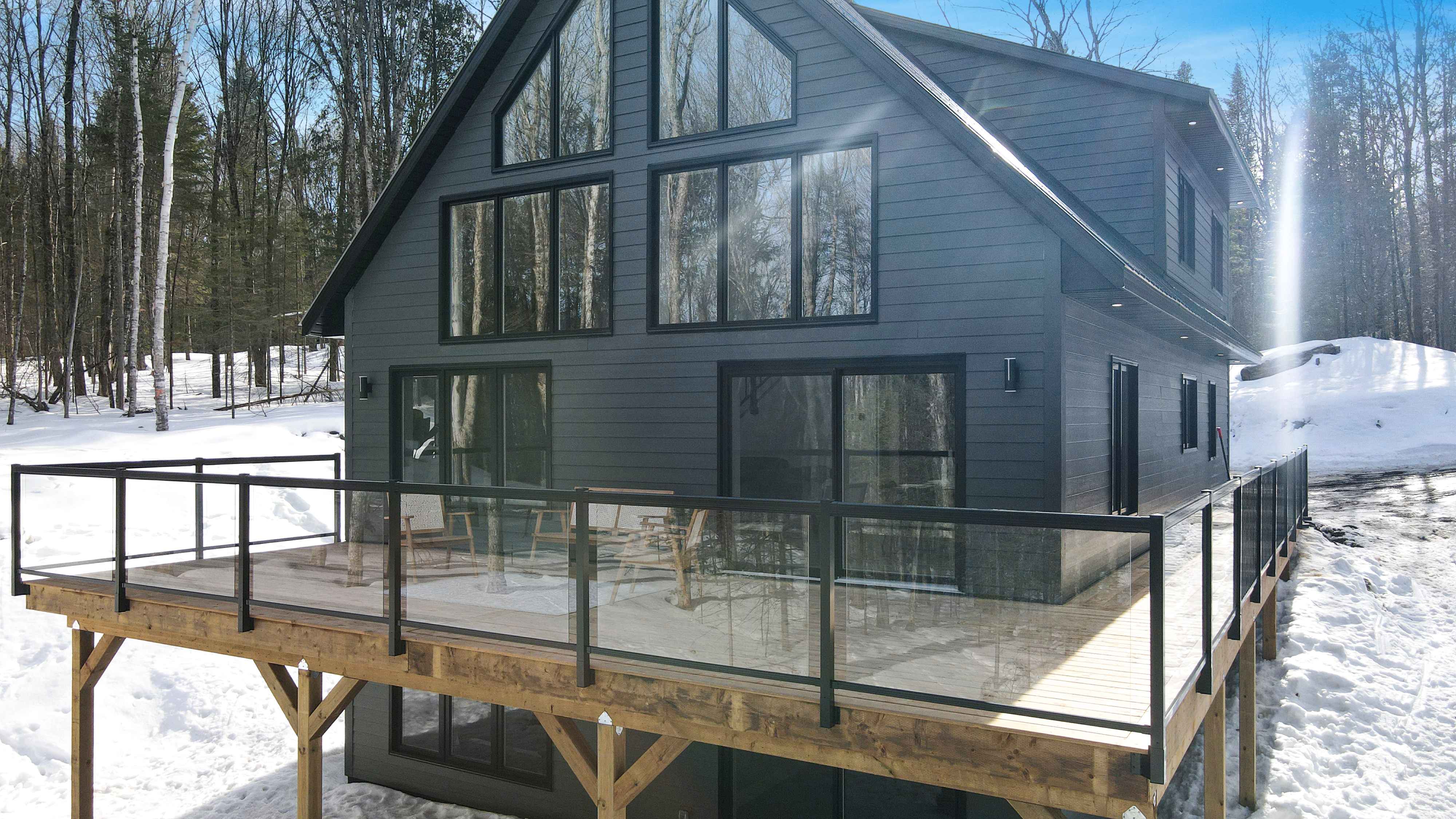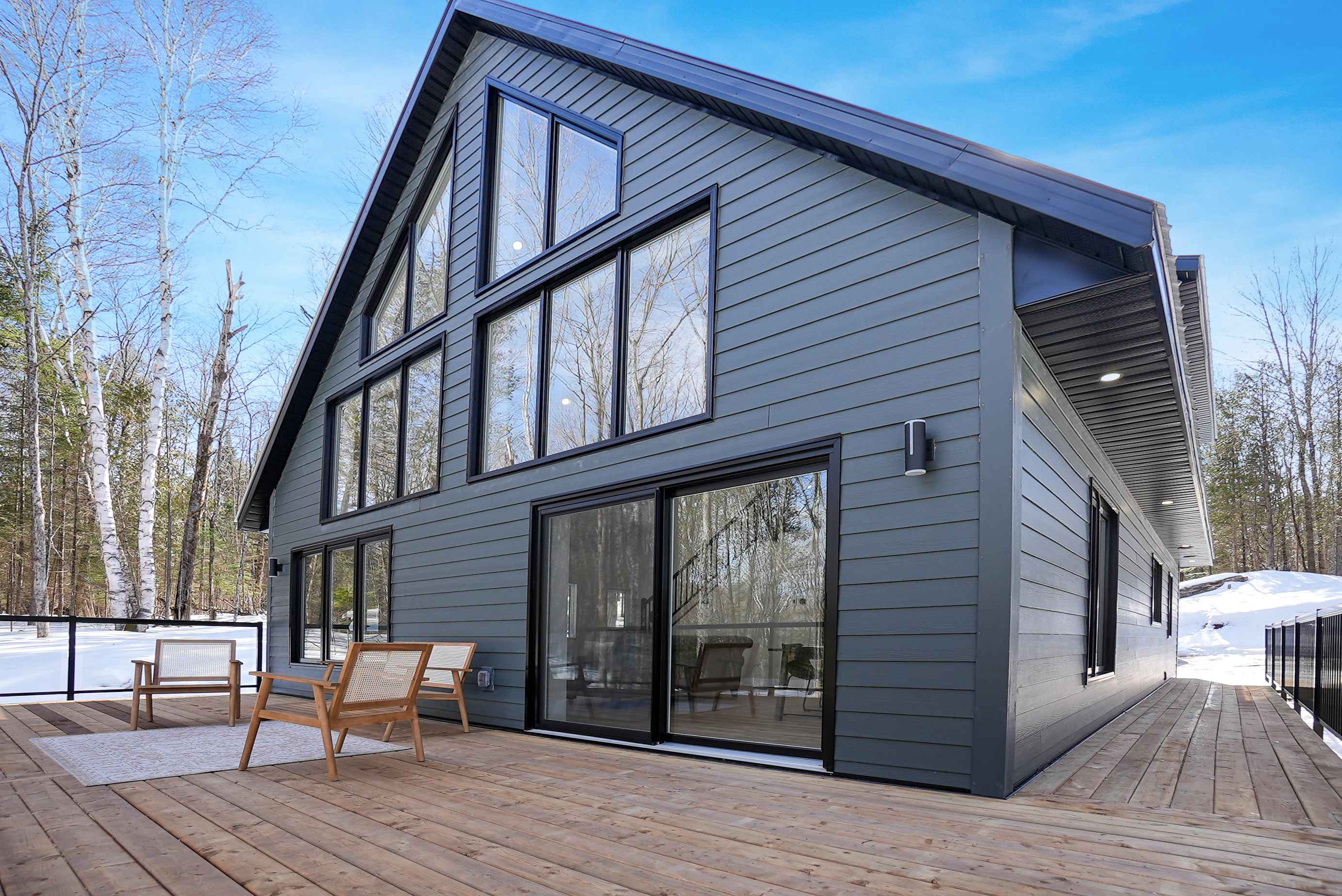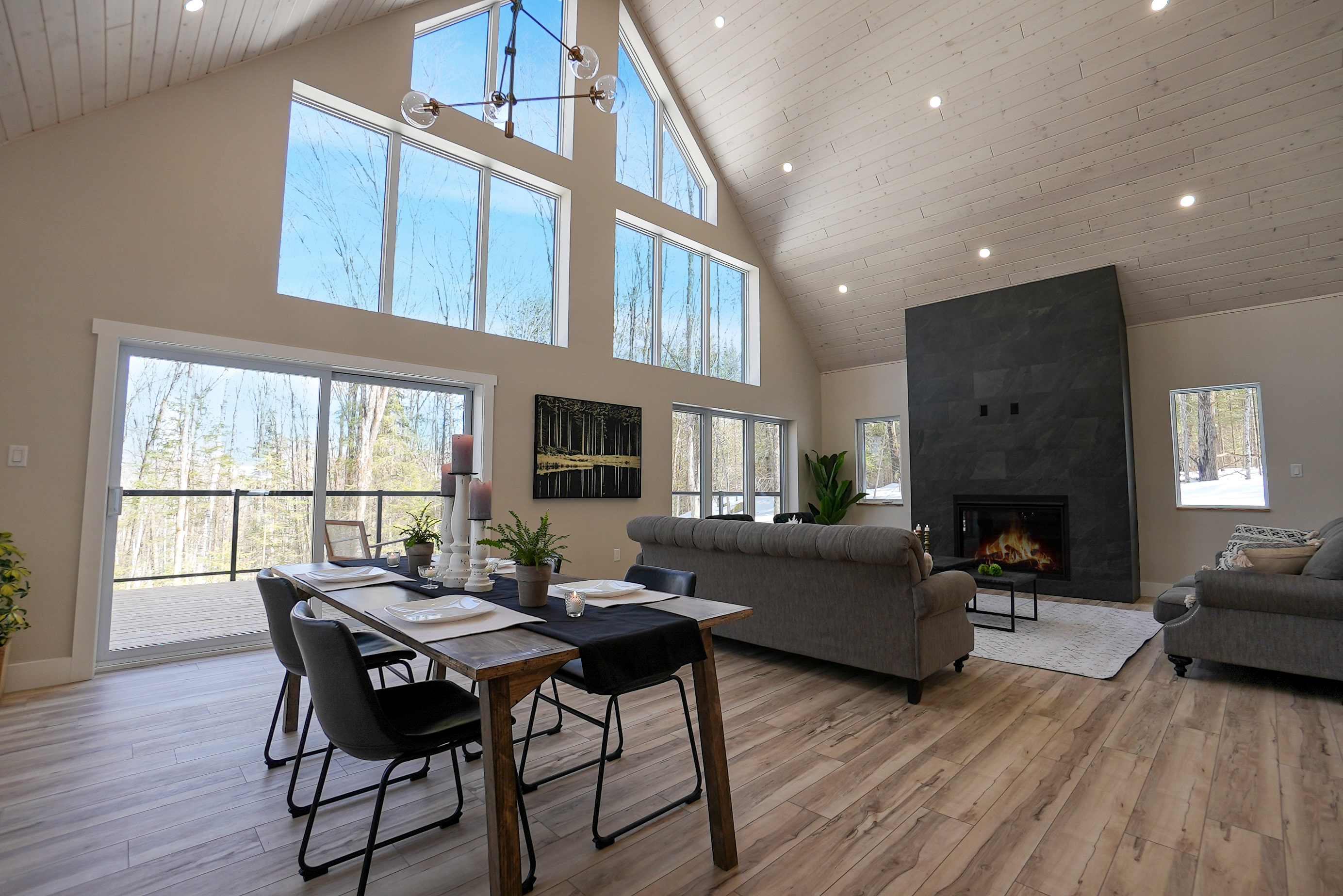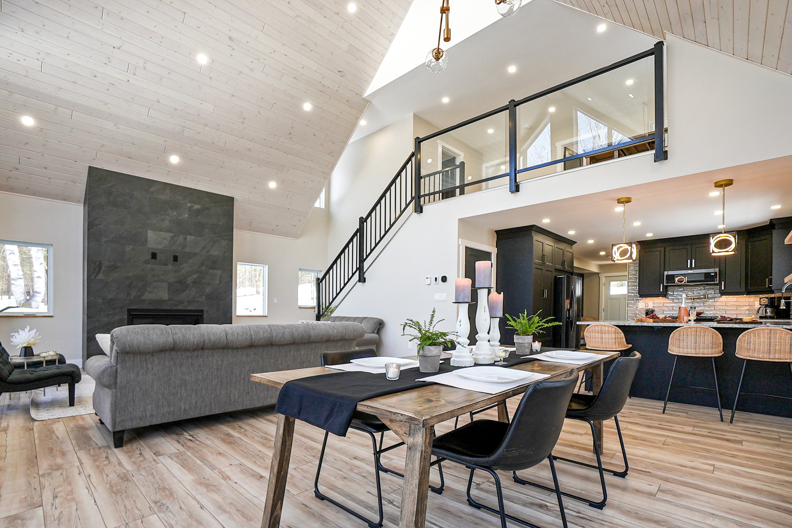The chalet's spacious and inviting open-concept living area features vaulted 22-foot ceilings, radiant in floor heat, security cameras, air conditioning, a beautiful stone fireplace, and large windows that provide ample natural light and stunning views of the surrounding landscape. The kitchen is a chef's dream, featuring top-of-the-line stainless steel appliances, quartz countertops, and ample cabinetry for storage. The dining area comfortably seats eight and is perfect for hosting family meals and entertaining guests. The four beautifully appointed bedrooms offer comfortable sleeping accommodations. The chalet's three full bathrooms and one half-bath have been meticulously designed with desirable finishes and modern fixtures. Outside, the chalet's spacious deck provides the perfect spot to enjoy the fresh Haliburton Highlands air and take in the beautiful views. The property also features a great 2+acre lot adjacent to a scenic pond.