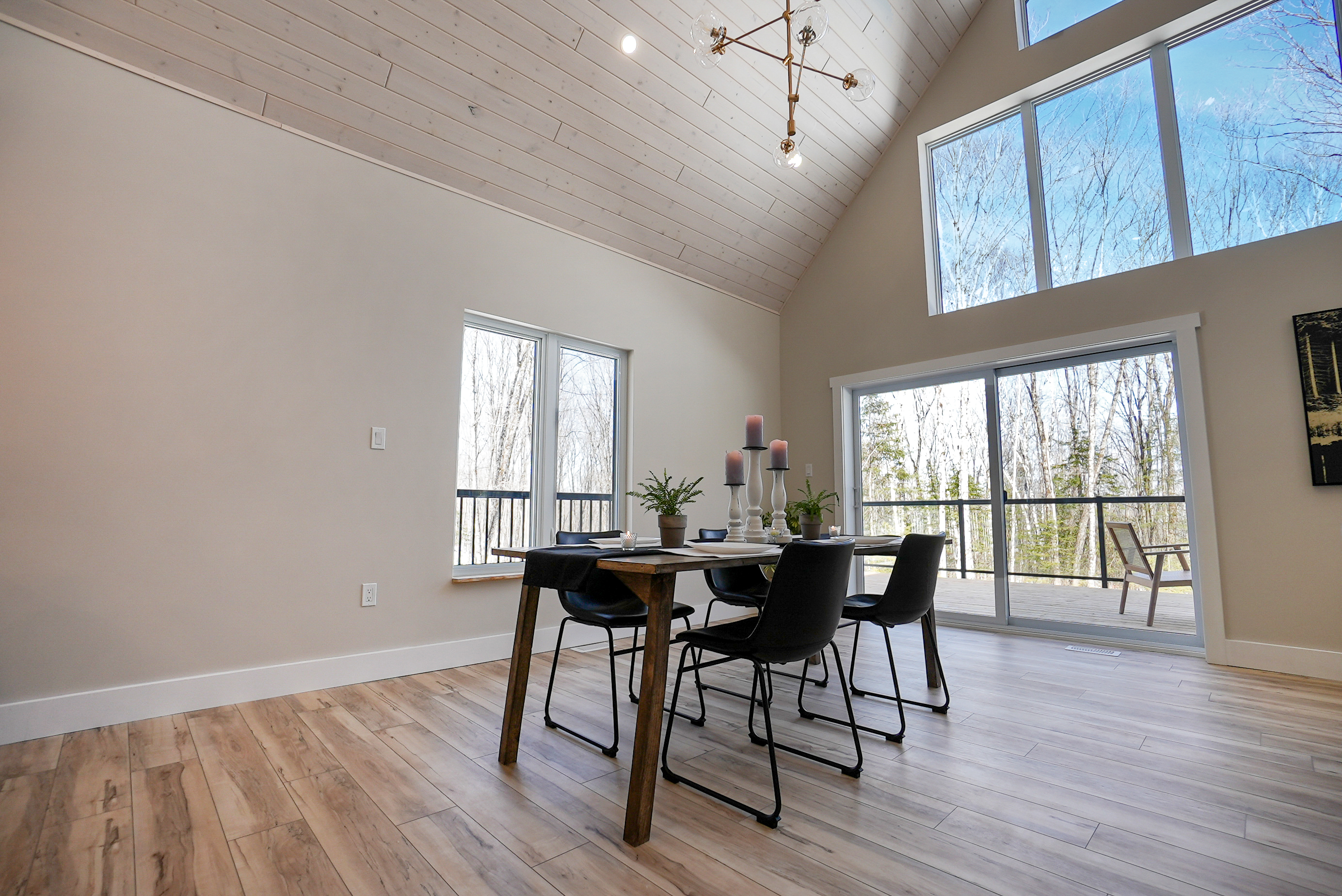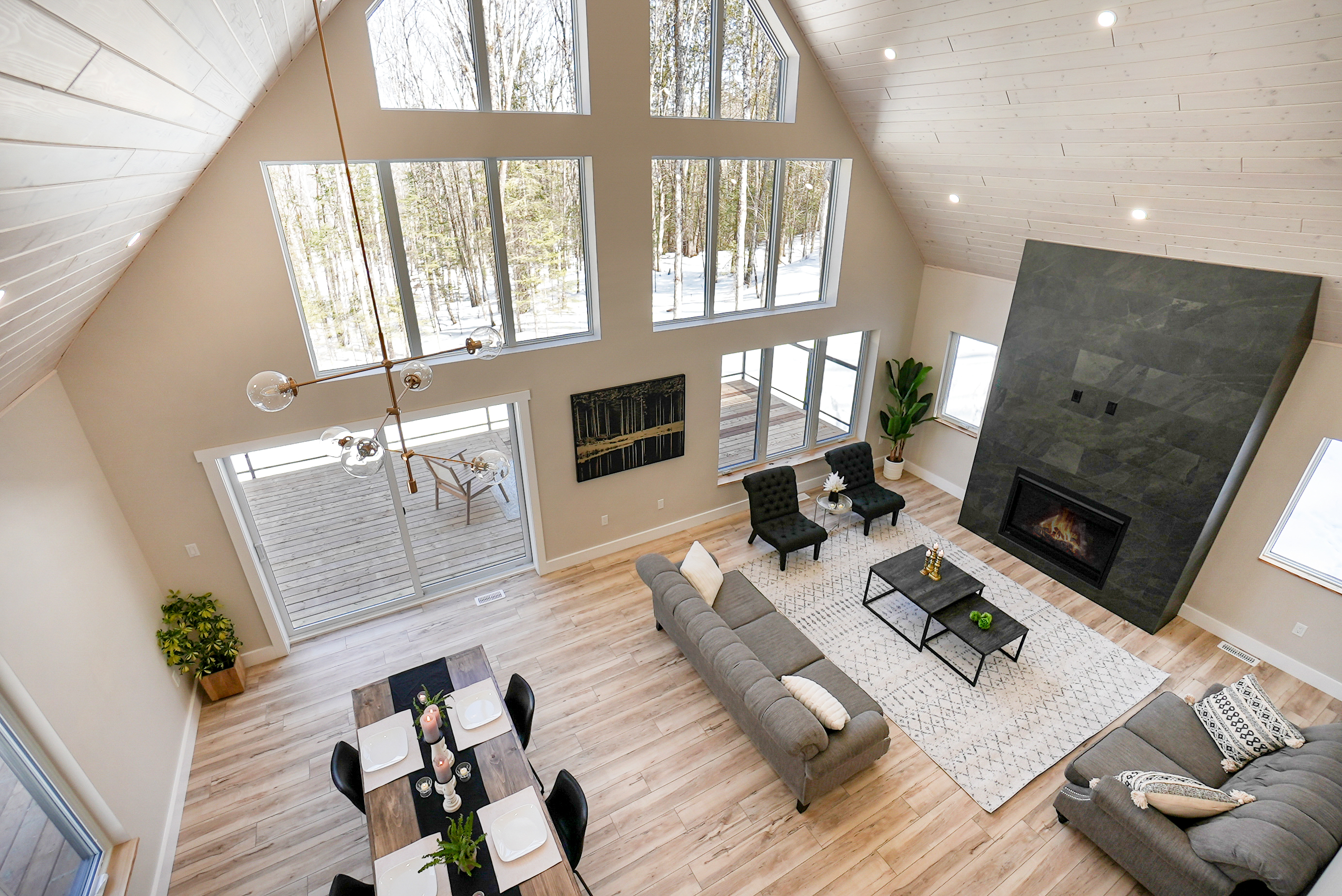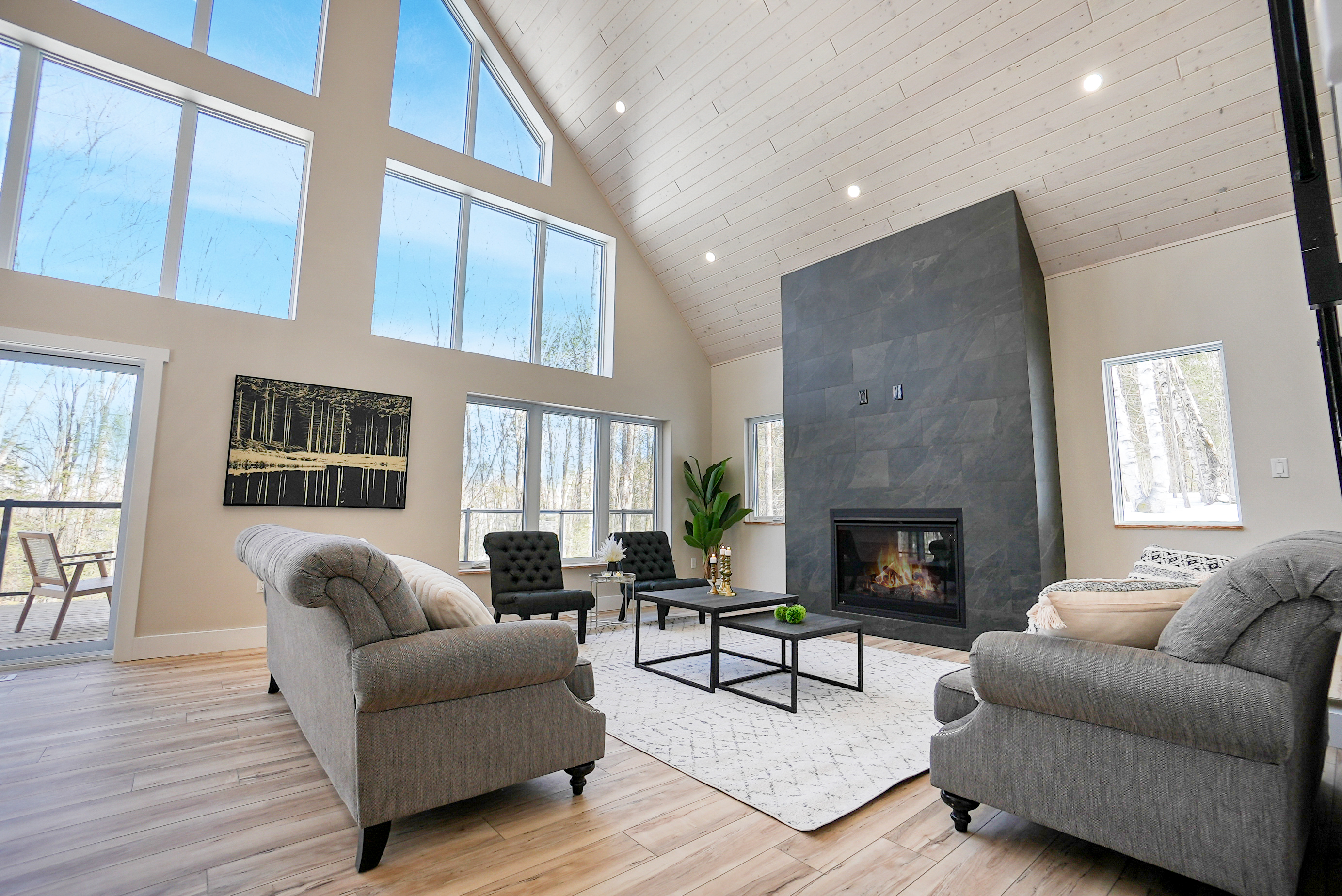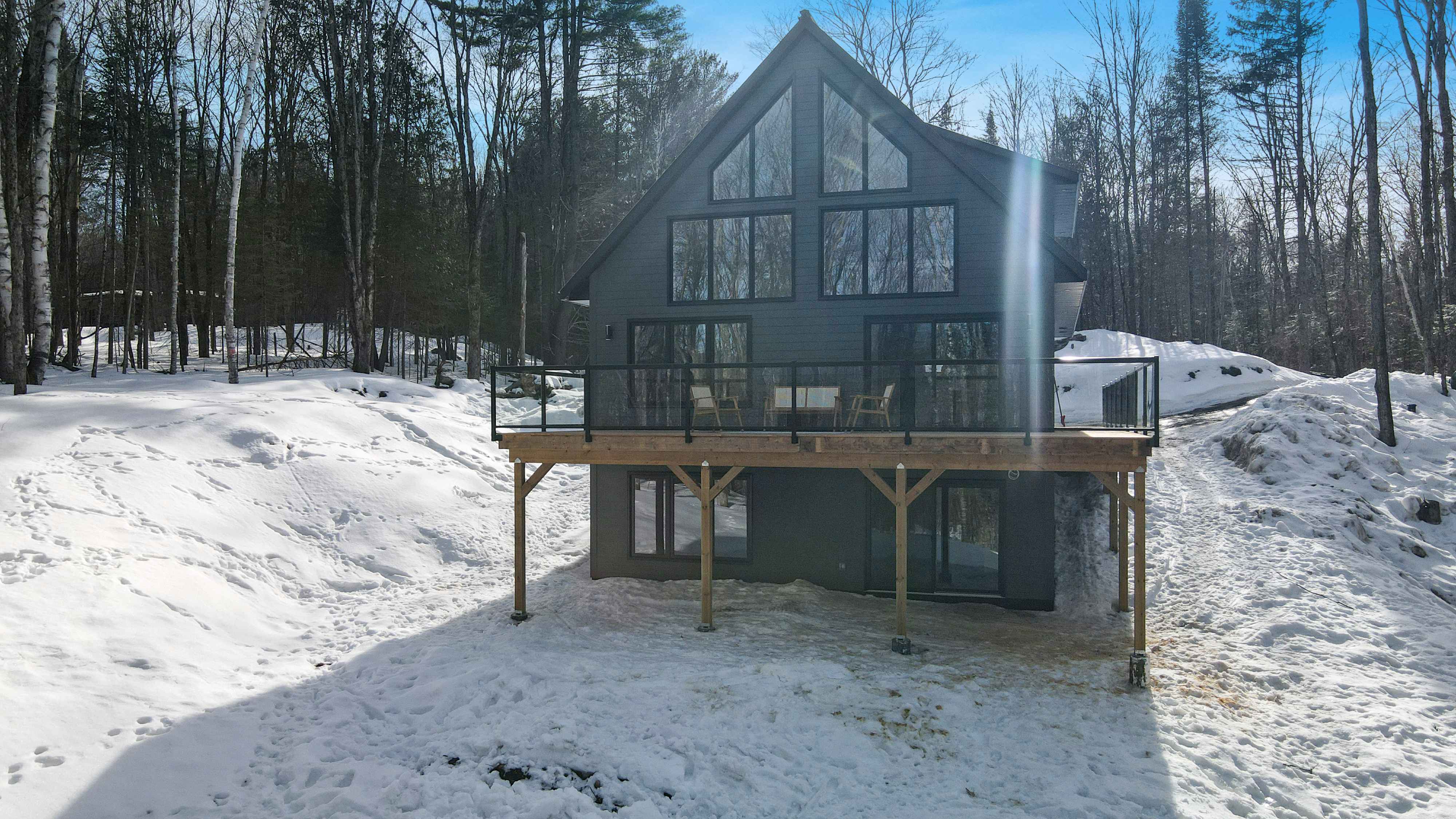 The chalet's spacious and inviting open-concept living area features vaulted 22-foot ceilings, radiant in floor heat, security cameras, air conditioning, a beautiful stone fireplace, and large windows that provide ample natural light and stunning views of the surrounding landscape. The kitchen is a chef's dream, featuring top-of-the-line stainless steel appliances, quartz countertops, and ample cabinetry for storage. The dining area comfortably seats eight and is perfect for hosting family meals and entertaining guests. The four beautifully appointed bedrooms offer comfortable sleeping accommodations. The chalet's three full bathrooms and one half-bath have been meticulously designed with desirable finishes and modern fixtures. Outside, the chalet's spacious deck provides the perfect spot to enjoy the fresh Haliburton Highlands air and take in the beautiful views. The property also features a great 2+acre lot adjacent to a scenic pond.