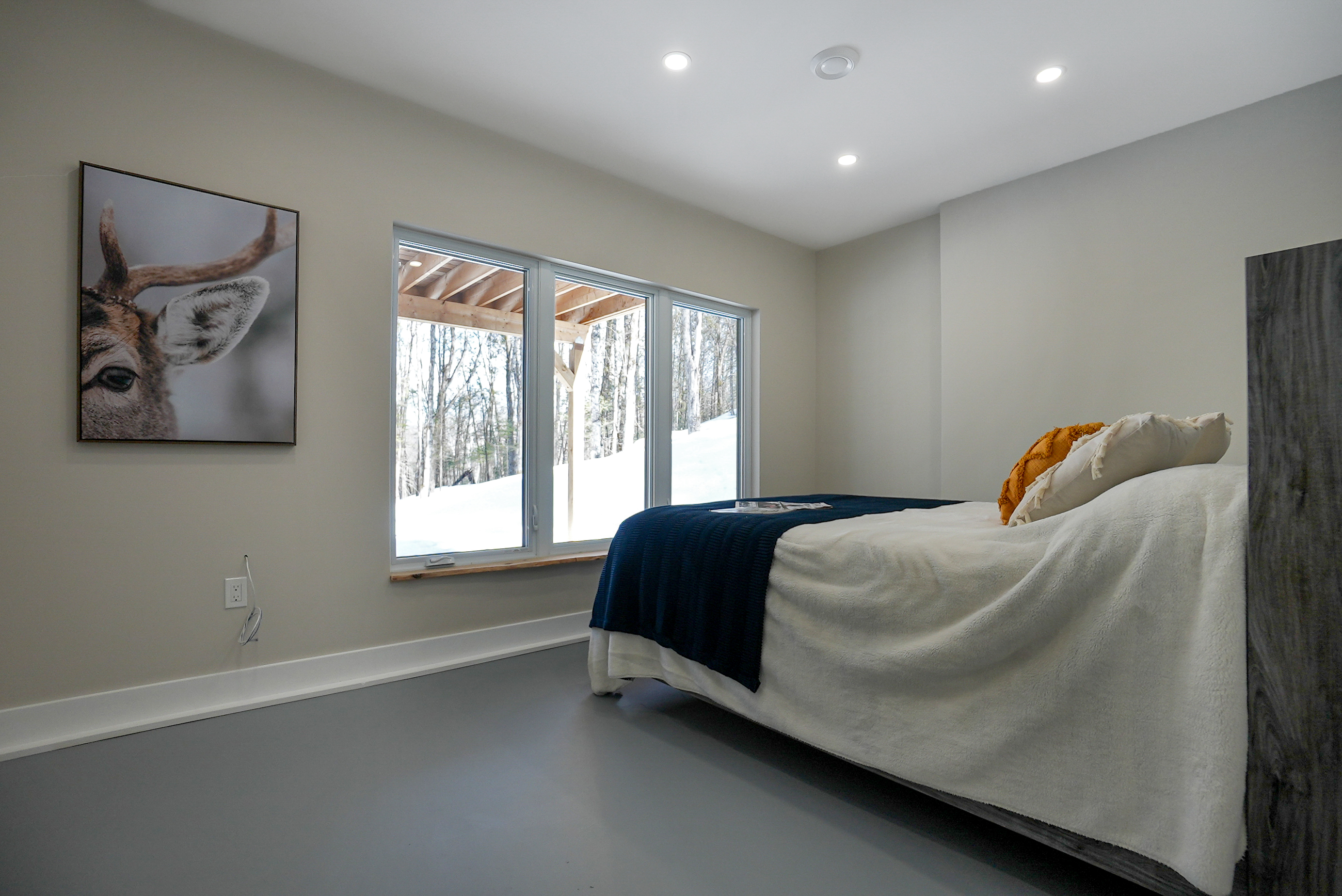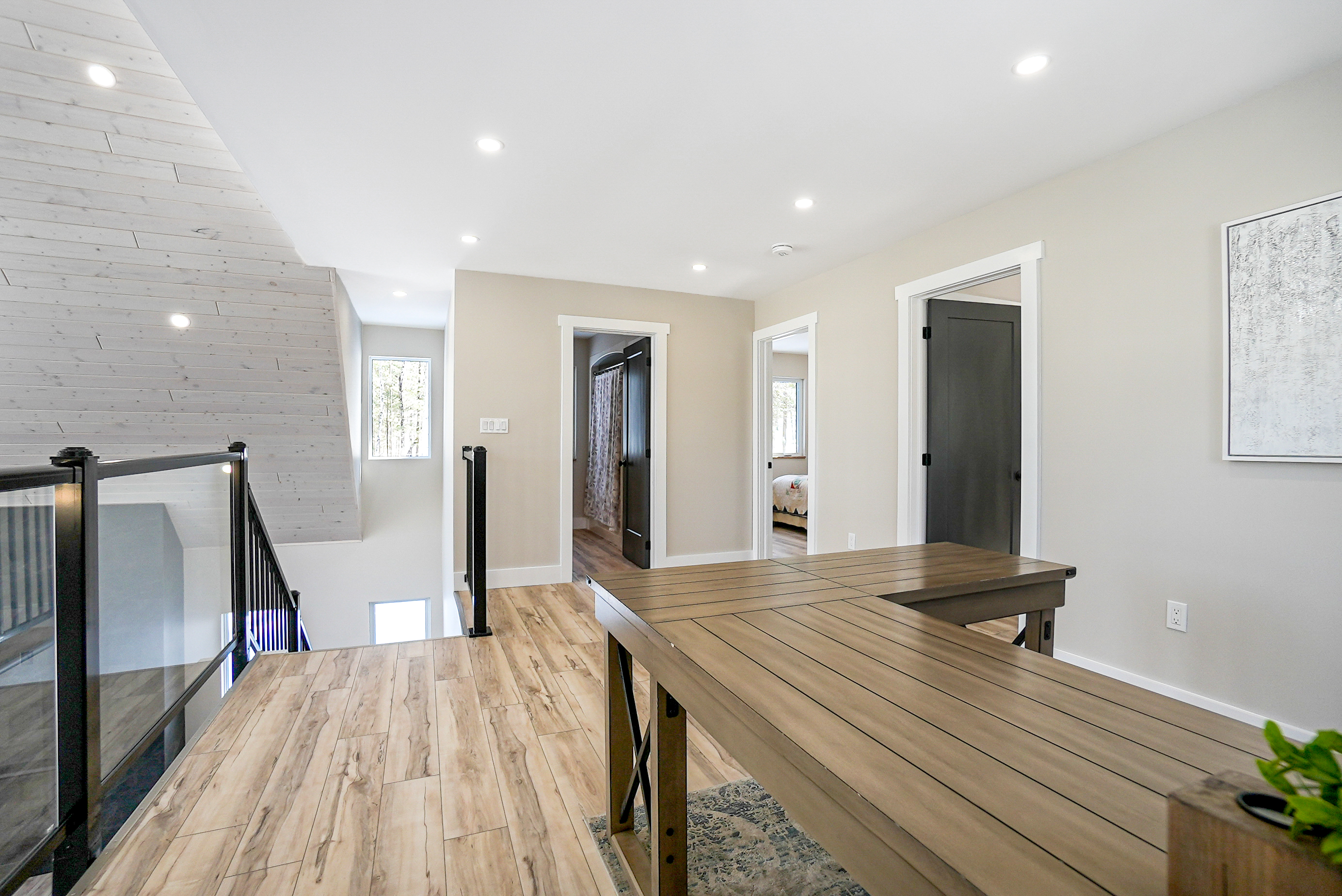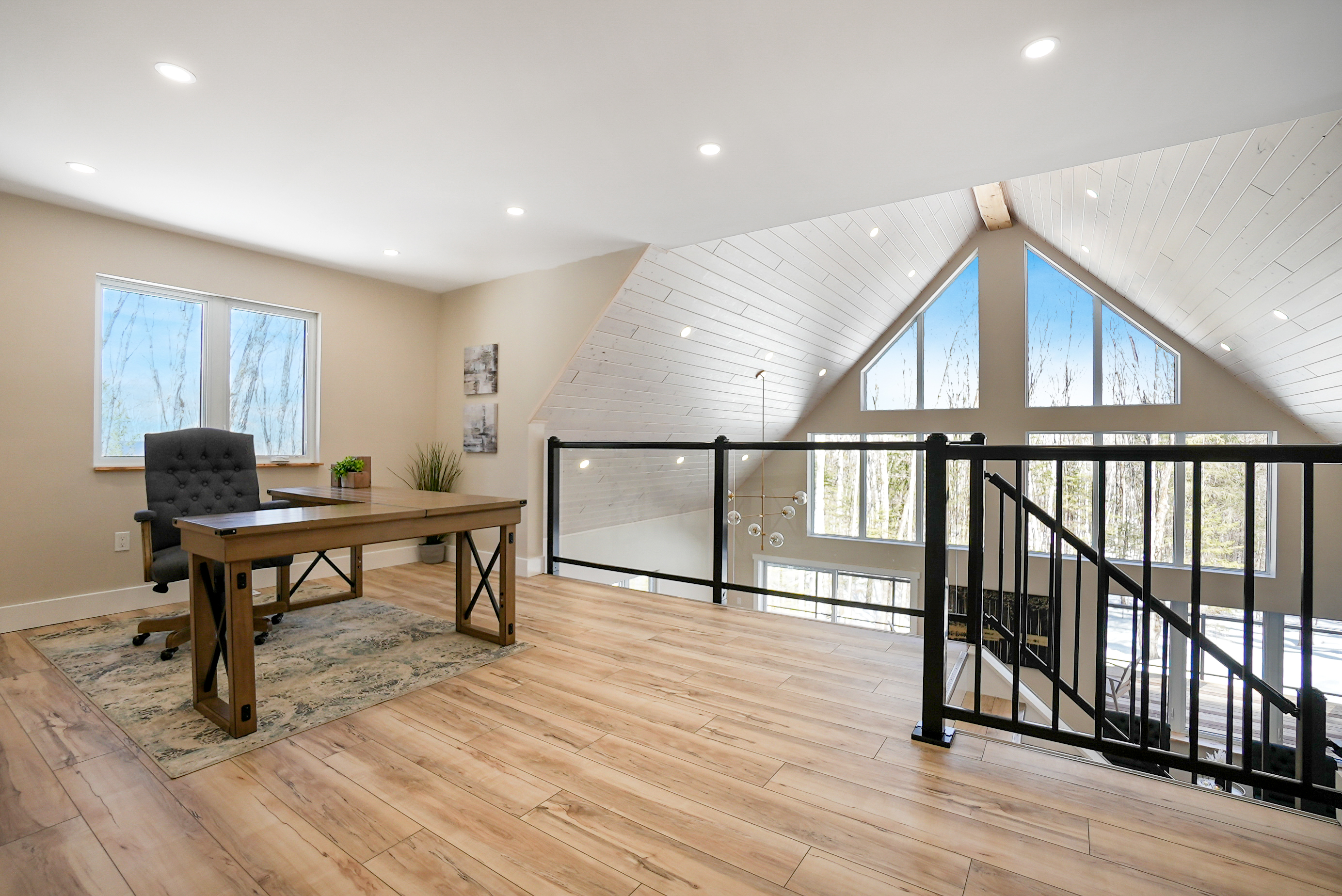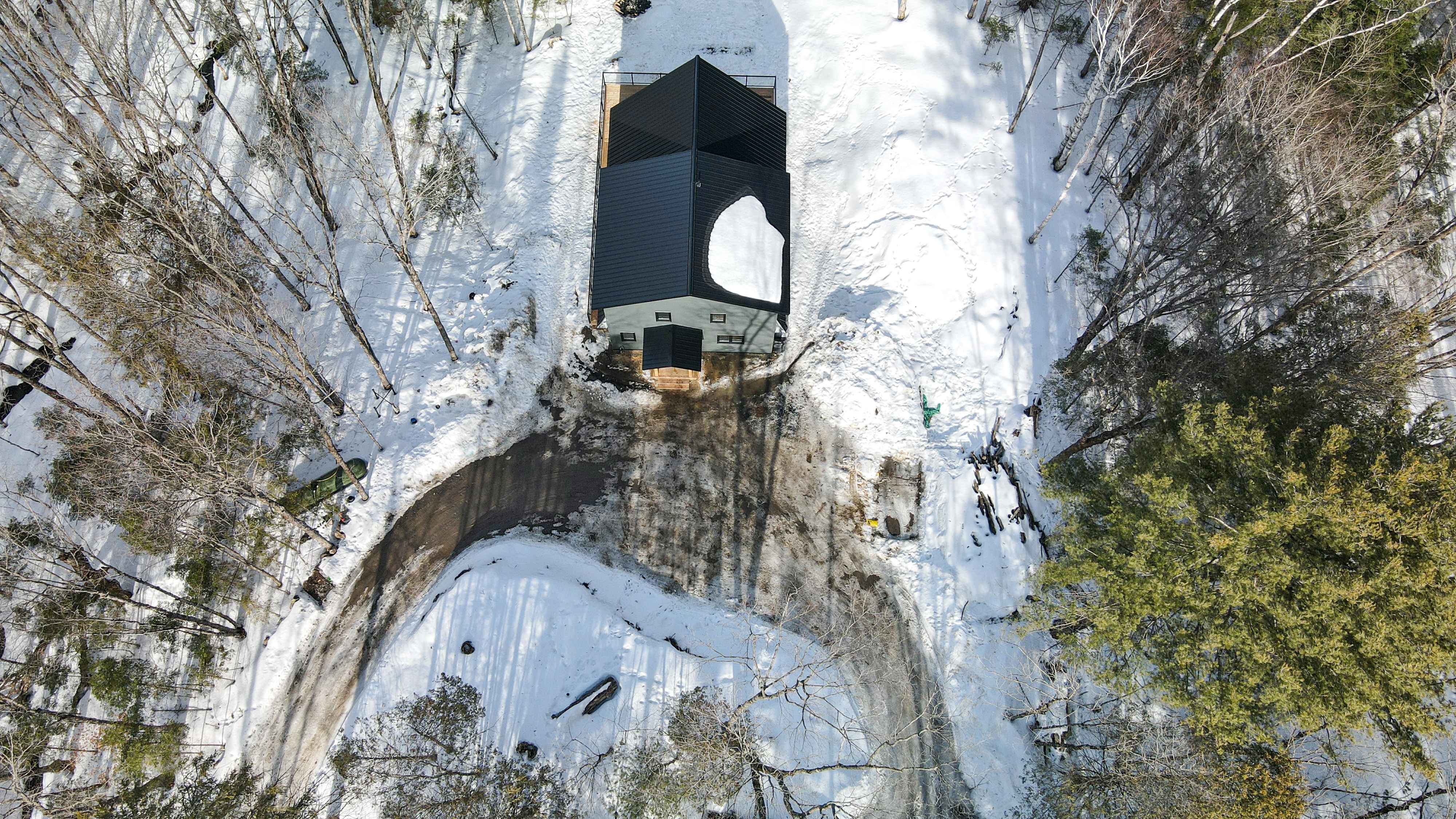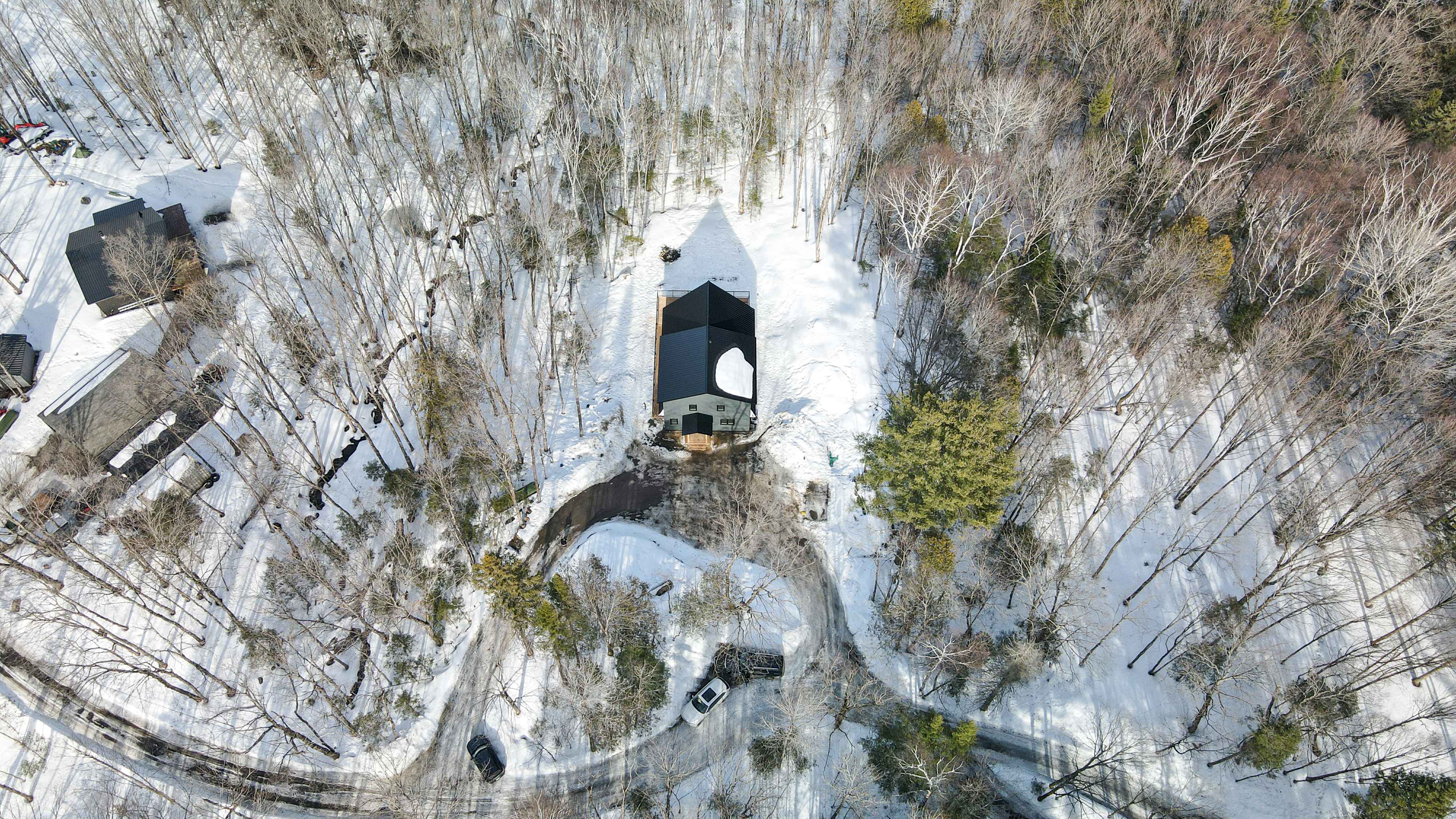 The chalet's spacious and inviting open-concept living area features vaulted 22-foot ceilings, radiant in floor heat, security cameras, air conditioning, a beautiful stone fireplace, and large windows that provide ample natural light and stunning views of the surrounding landscape. The kitchen is a chef's dream, featuring top-of-the-line stainless steel appliances, quartz countertops, and ample cabinetry for storage. The dining area comfortably seats eight and is perfect for hosting family meals and entertaining guests. The four beautifully appointed bedrooms offer comfortable sleeping accommodations. The chalet's three full bathrooms and one half-bath have been meticulously designed with desirable finishes and modern fixtures. Outside, the chalet's spacious deck provides the perfect spot to enjoy the fresh Haliburton Highlands air and take in the beautiful views. The property also features a great 2+acre lot adjacent to a scenic pond.