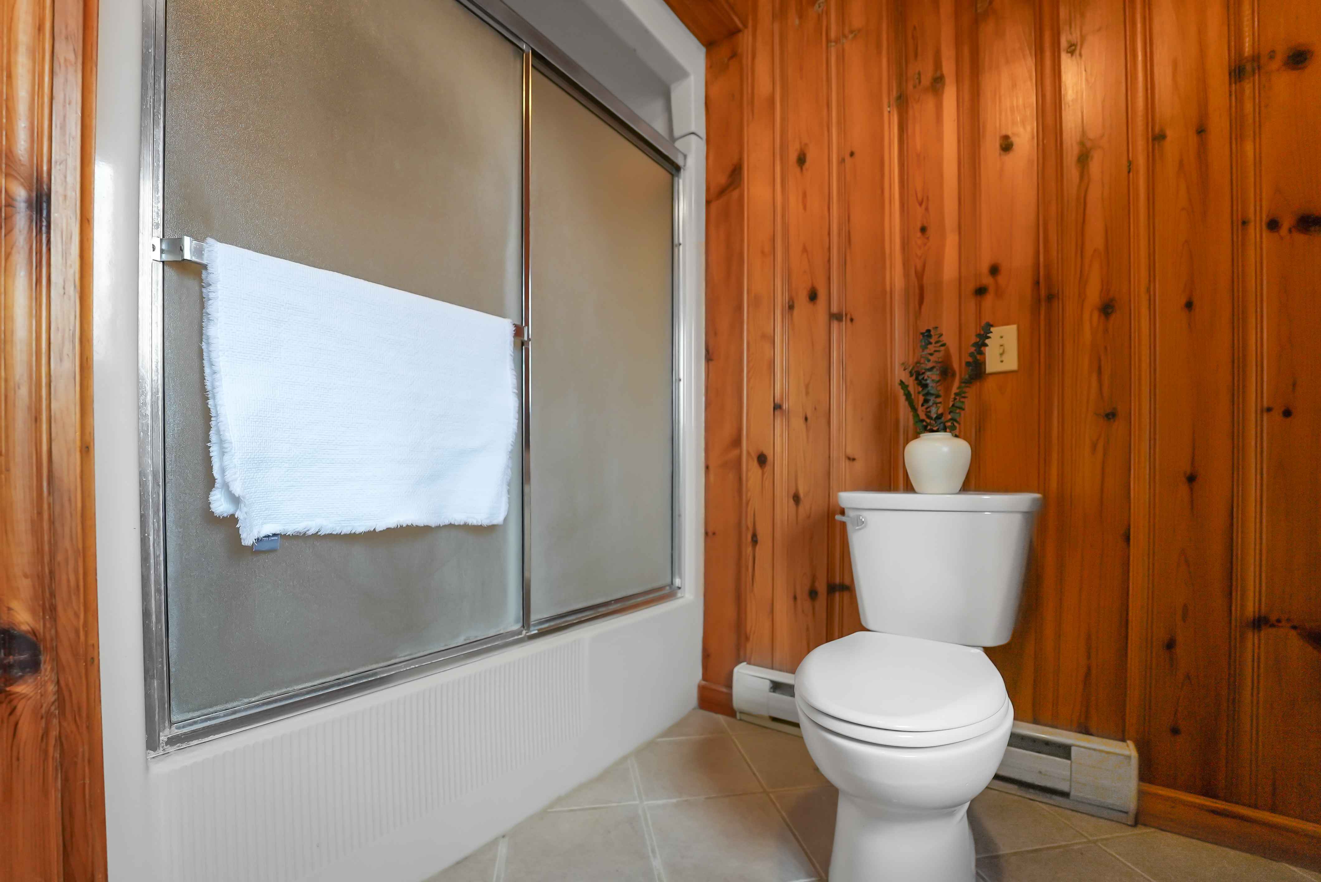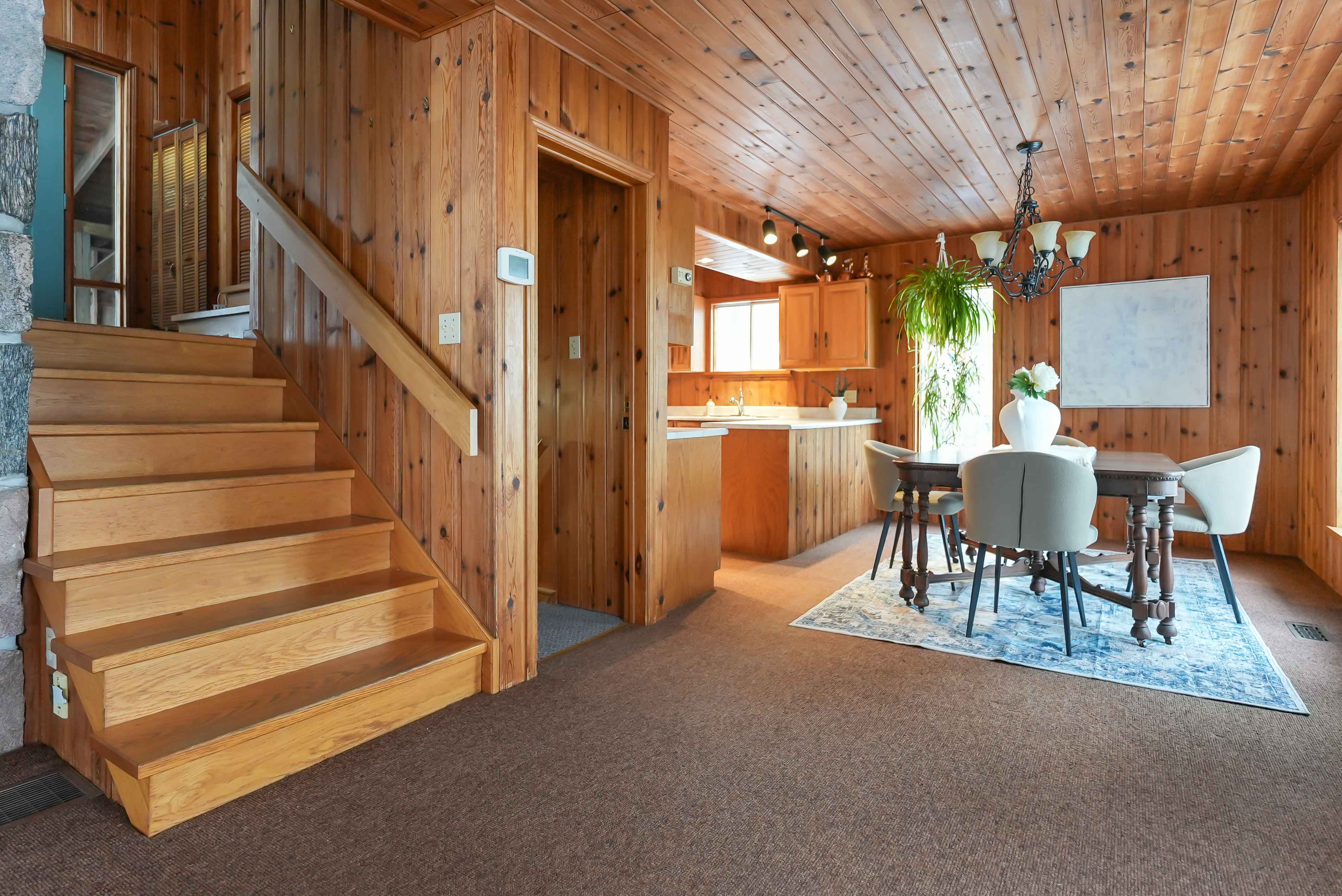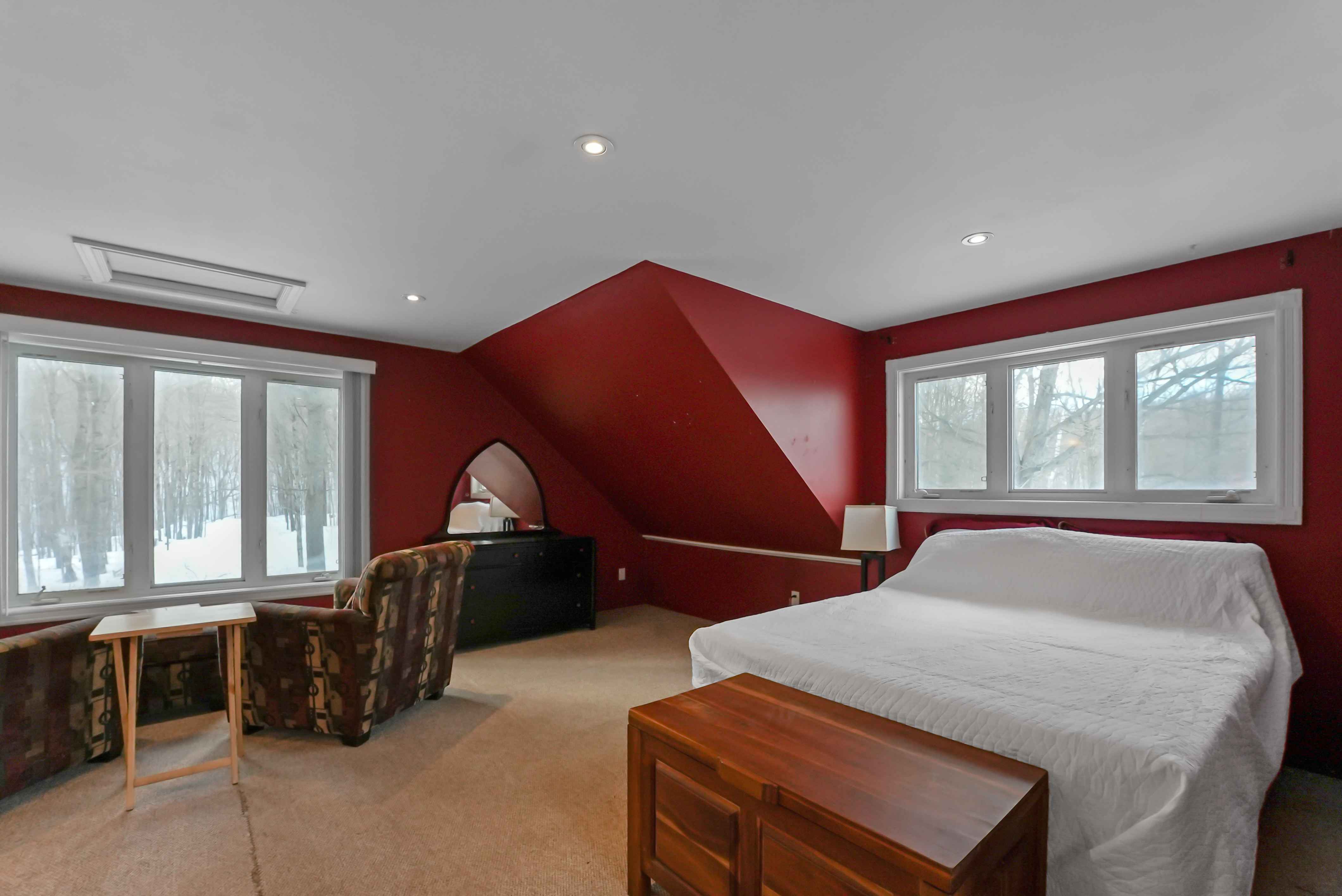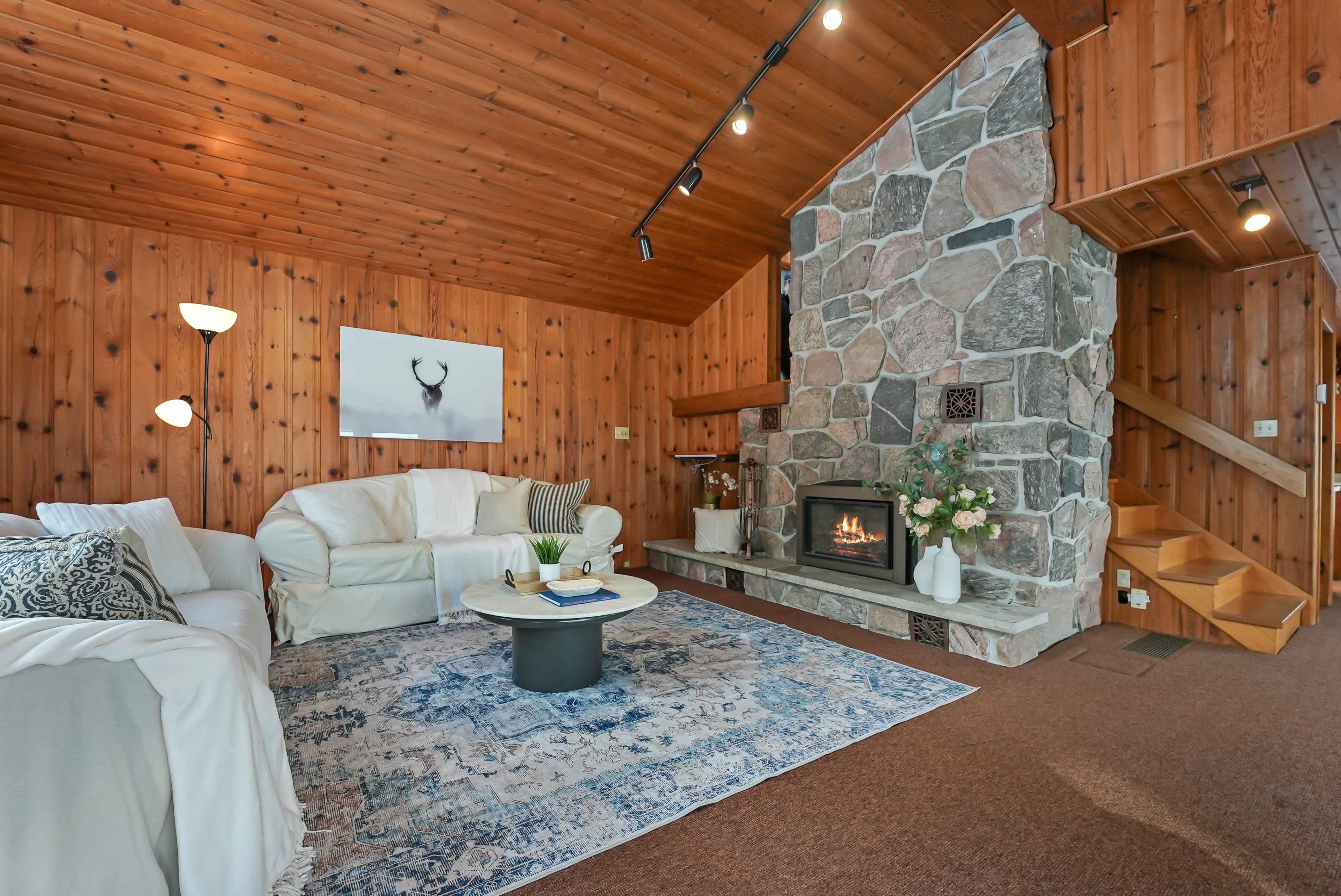 The home features a cathedral ceiling great room with a floor-to-ceiling granite stone fireplace and a convenient propane insert, leading out to a spacious lakeside deck. Located on a year-round road, halfway between Minden and Haliburton, this property is perfect for four-season living or as a cottage retreat.