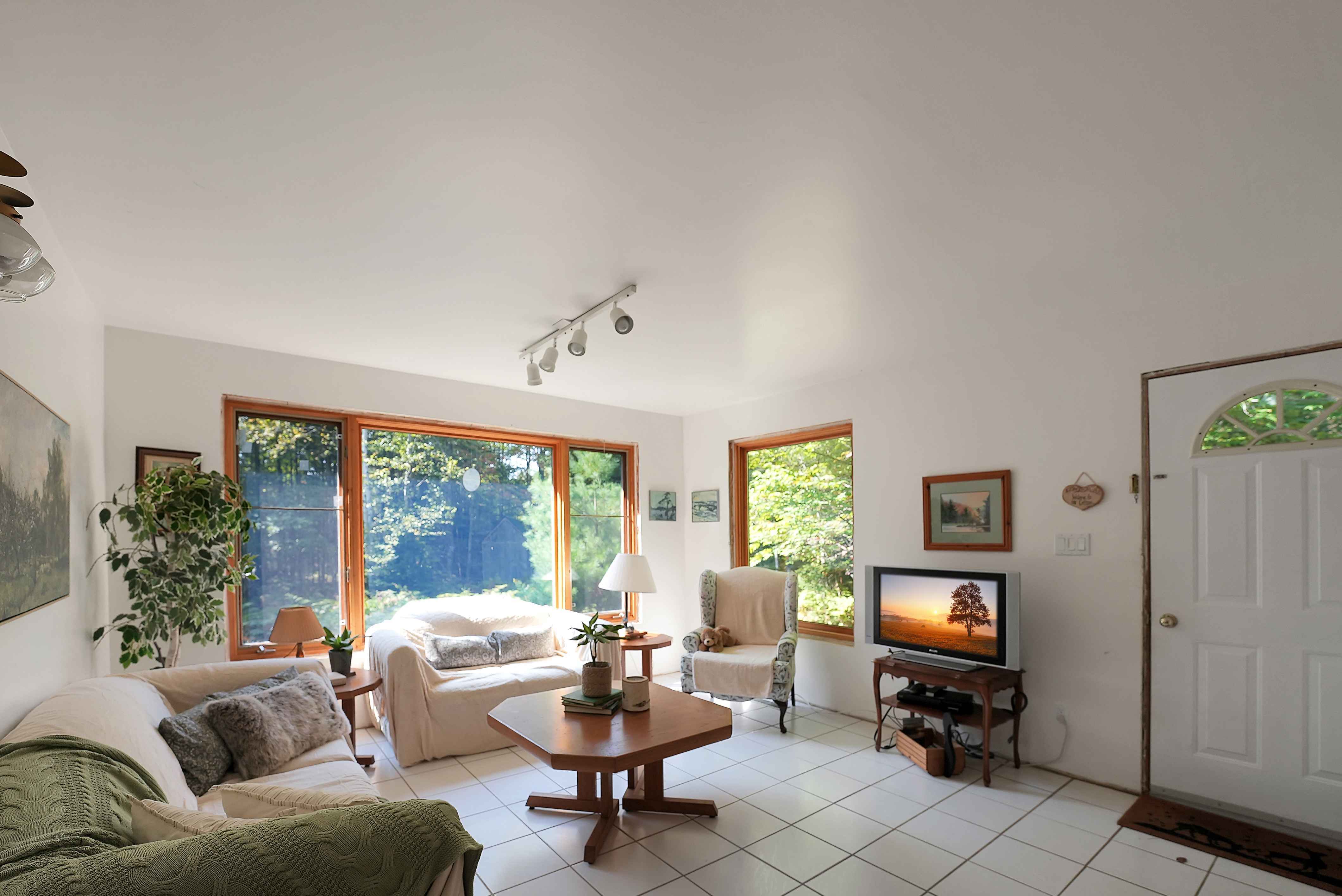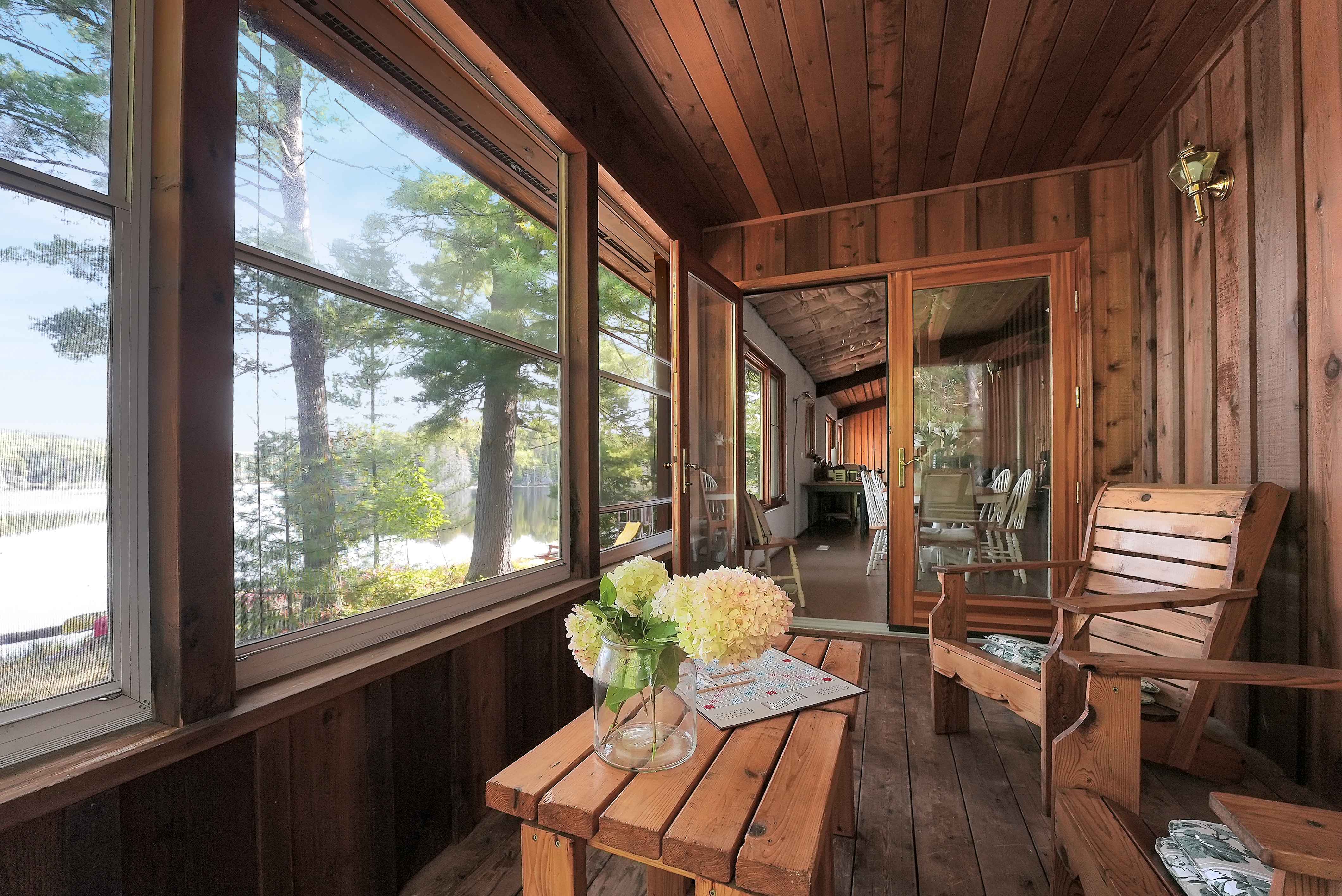On the shores of this private lake sits a spacious, four-season dwelling. The main level features a large primary bedroom, 1.5 bathrooms, and an open-concept living and dining area with impressive 12-foot cathedral ceilings. The kitchen is spacious, and the sunroom offers a bright, relaxing space. A screened-in porch provides stunning views of the lake, making it an ideal spot for outdoor enjoyment in all seasons.