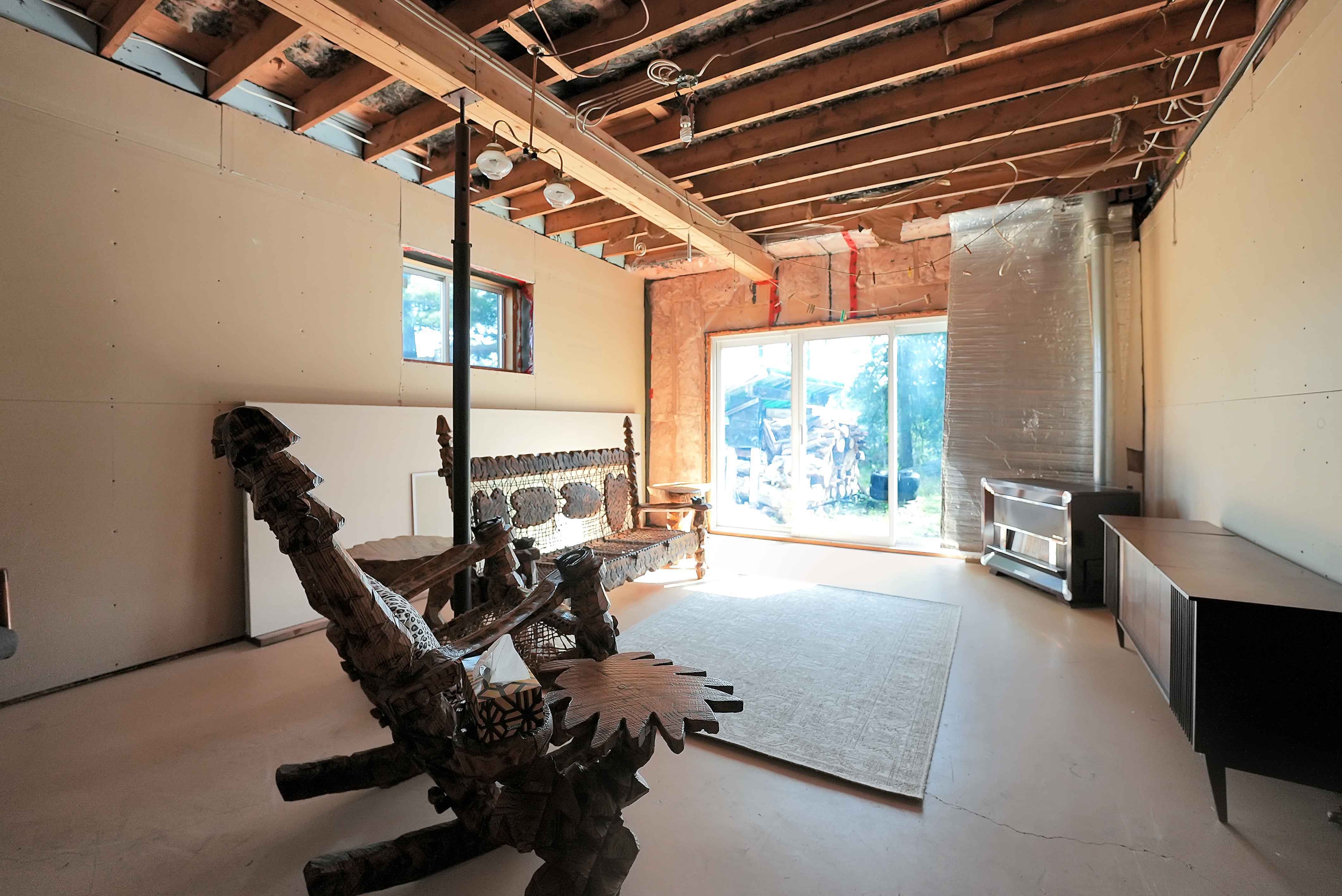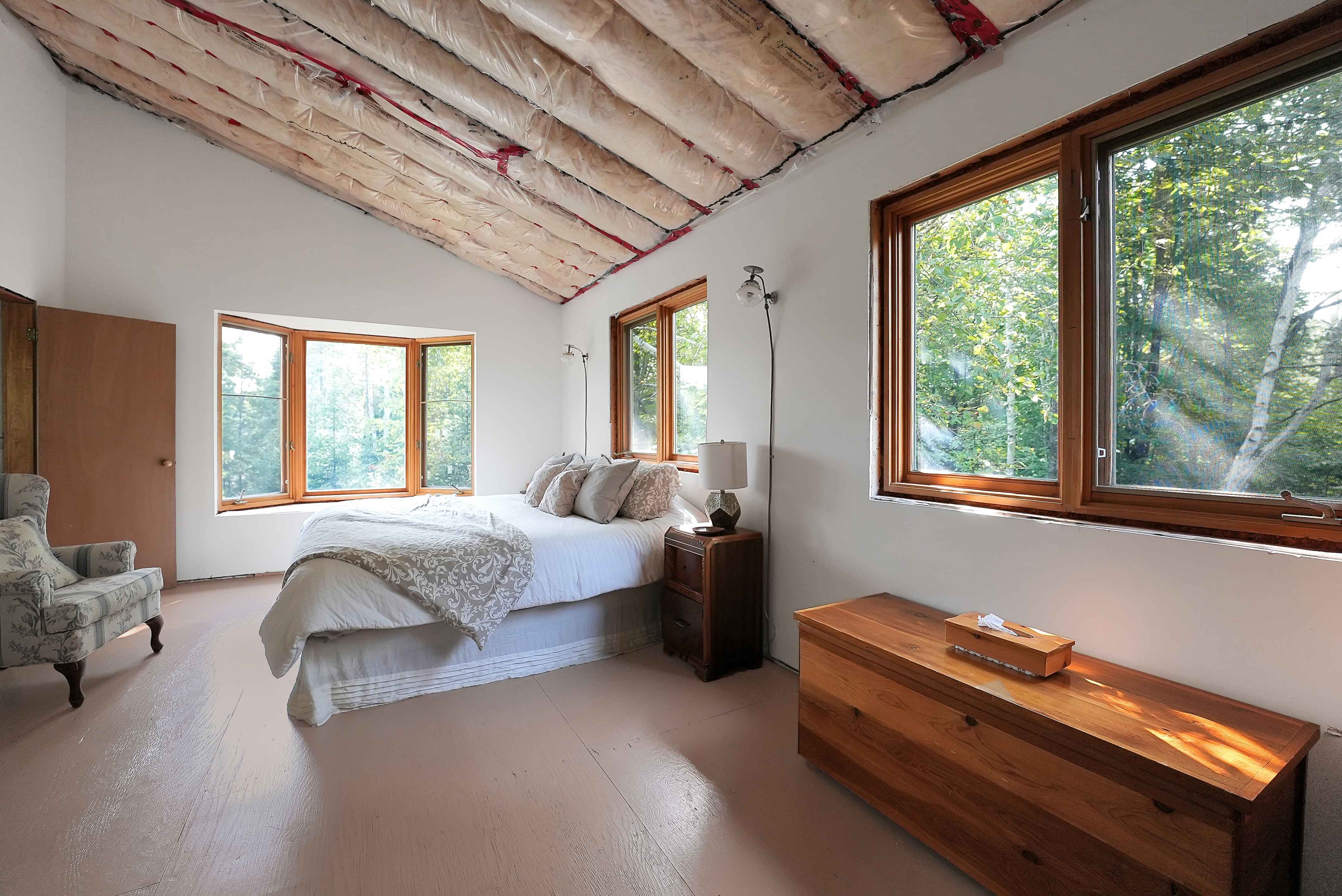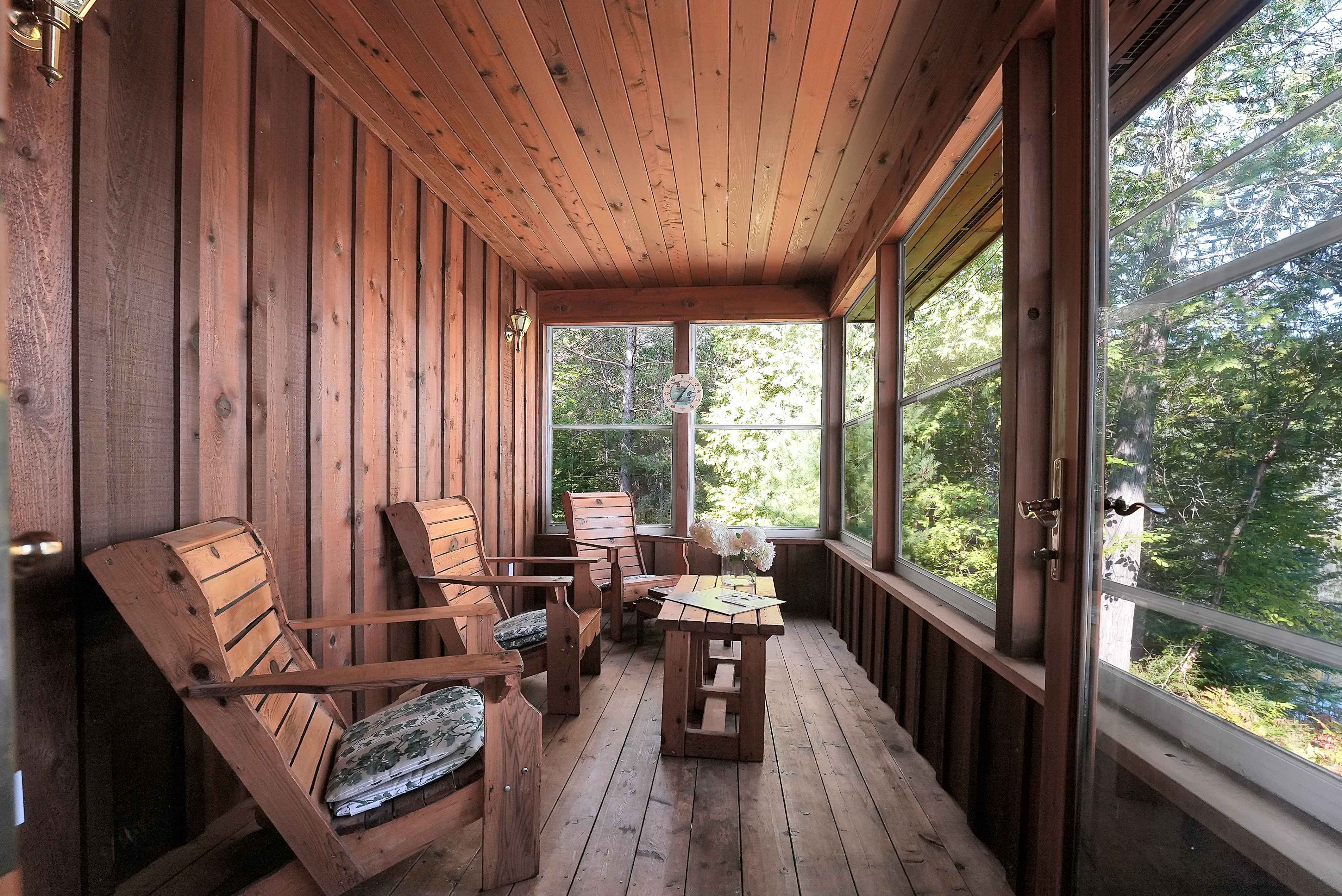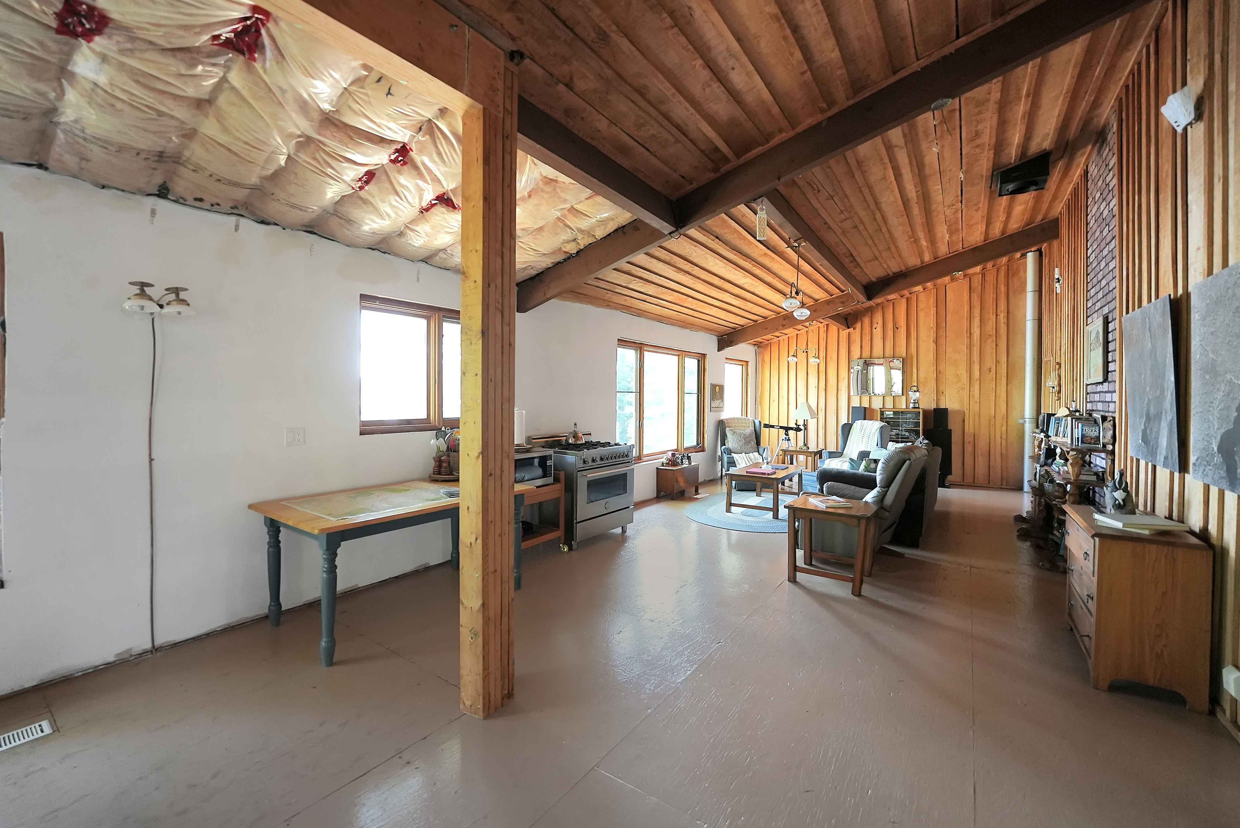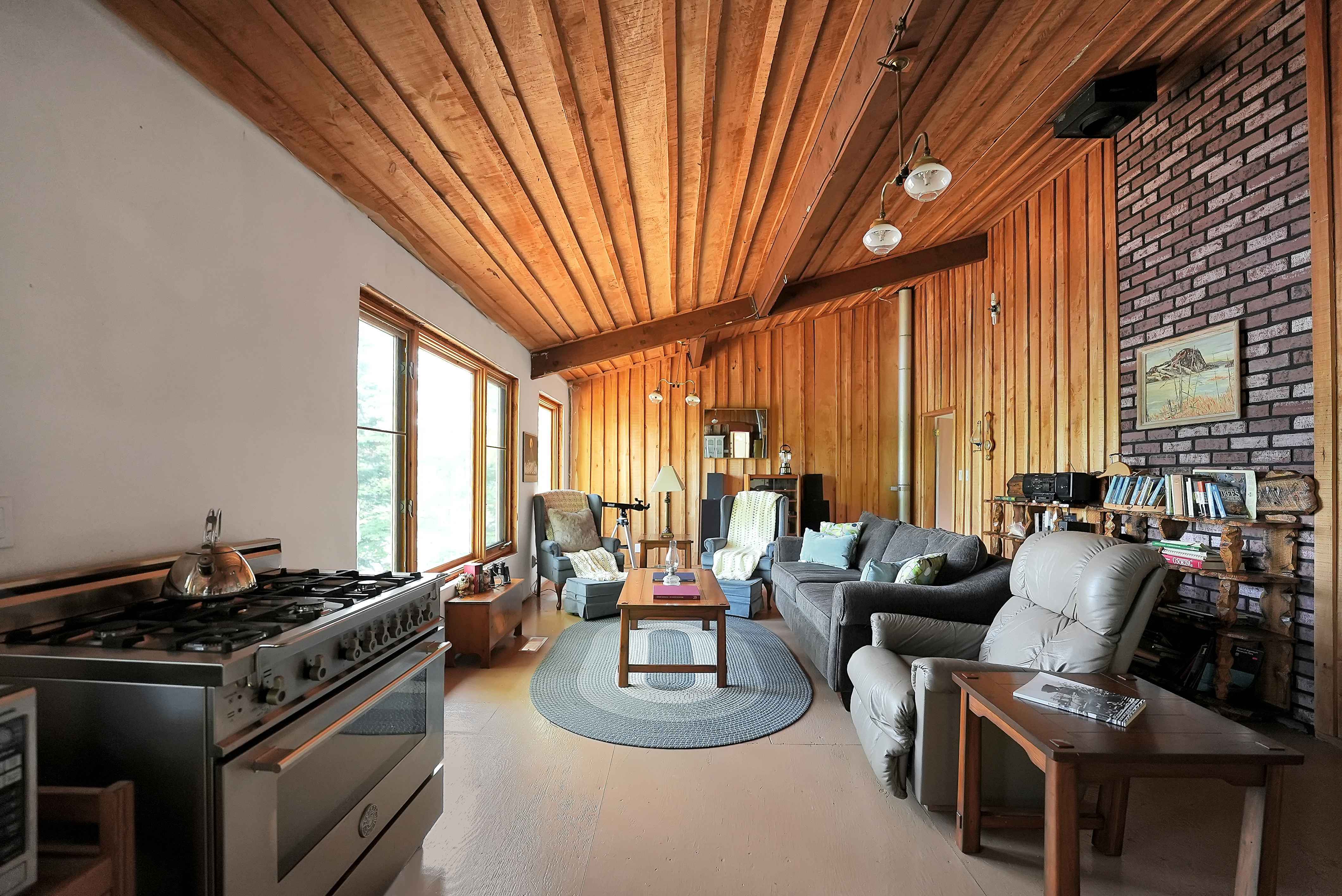 The fully finished walkout basement extends the living space with two additional bedrooms, and its 9-foot high ceilings create a feeling of openness. Heating is efficient, with both a propane stove and a wood stove ensuring warmth and comfort year-round. The cottage is well-insulated, with R-20 insulation in the walls and R-50 in the roof.
