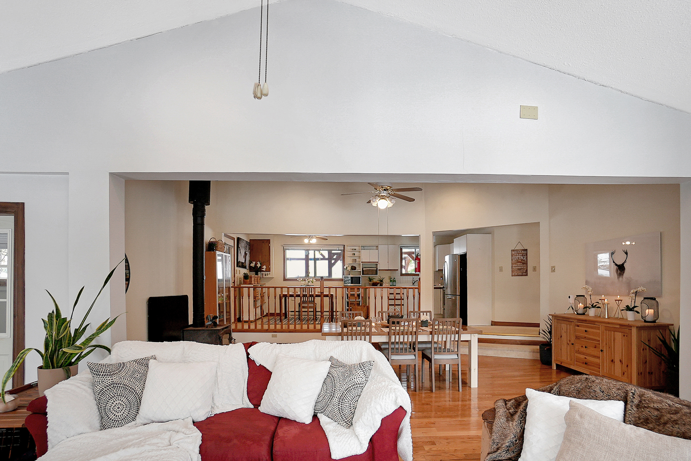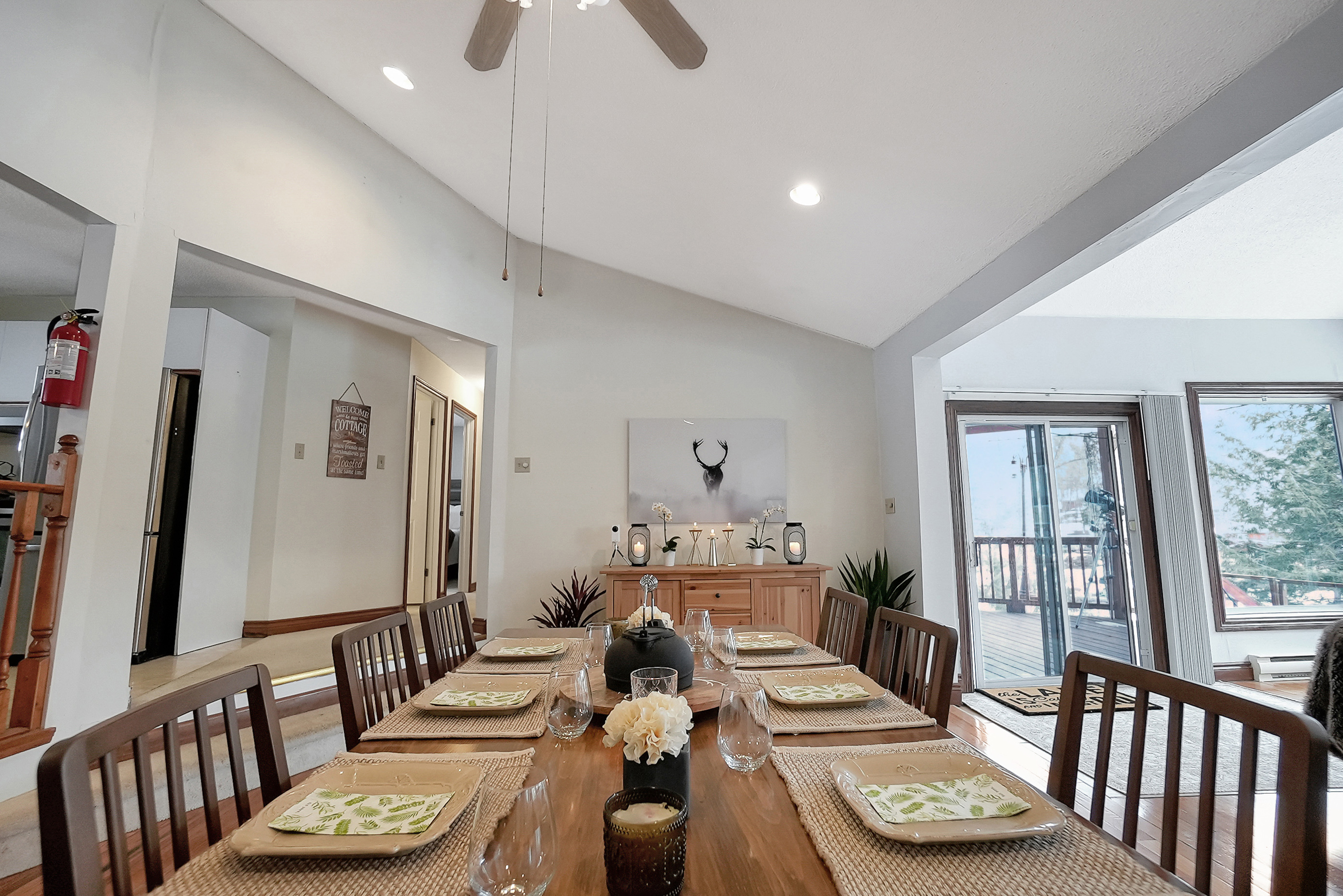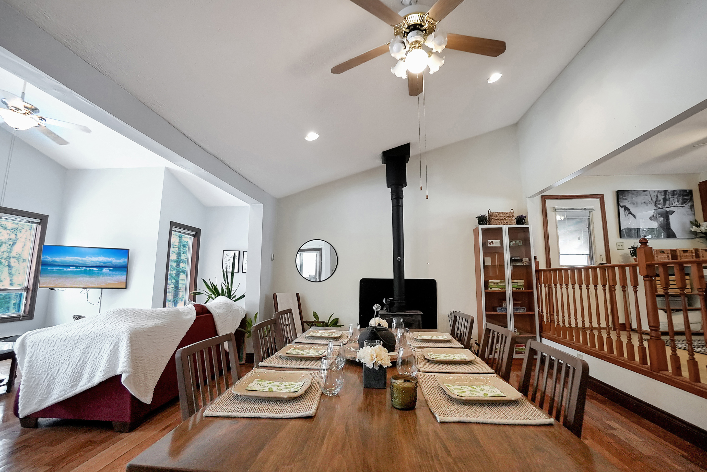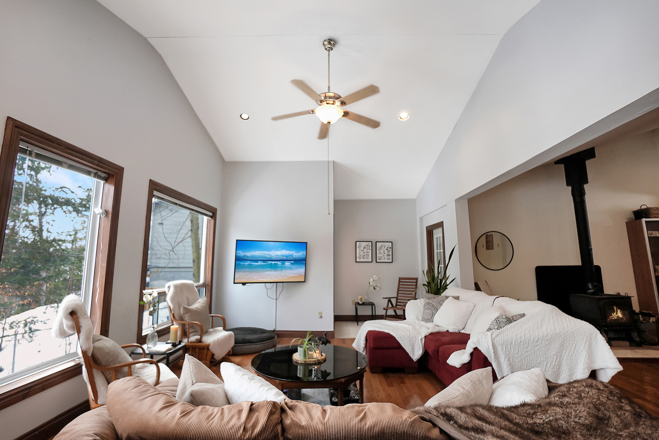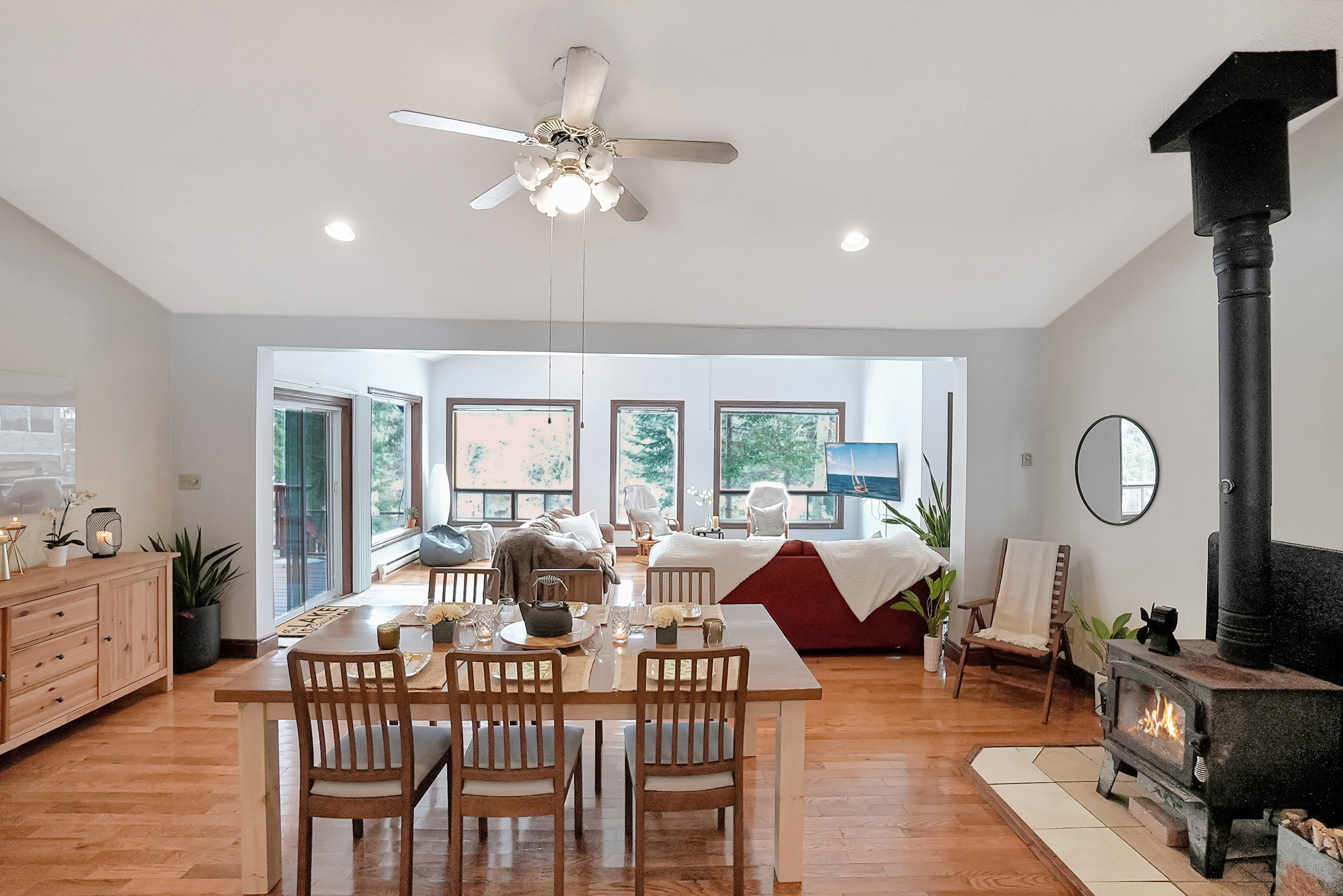 As you step inside, you'll be greeted by a spacious and inviting open concept living room, dining room, and kitchen area. The living room features large windows that provide breathtaking views of the lake, and a cozy wood-burning fireplace, perfect for chilly evenings. The dining area comfortably seats ten and is ideal for entertaining. The kitchen is fully equipped with modern appliances and ample counter space for preparing meals.
