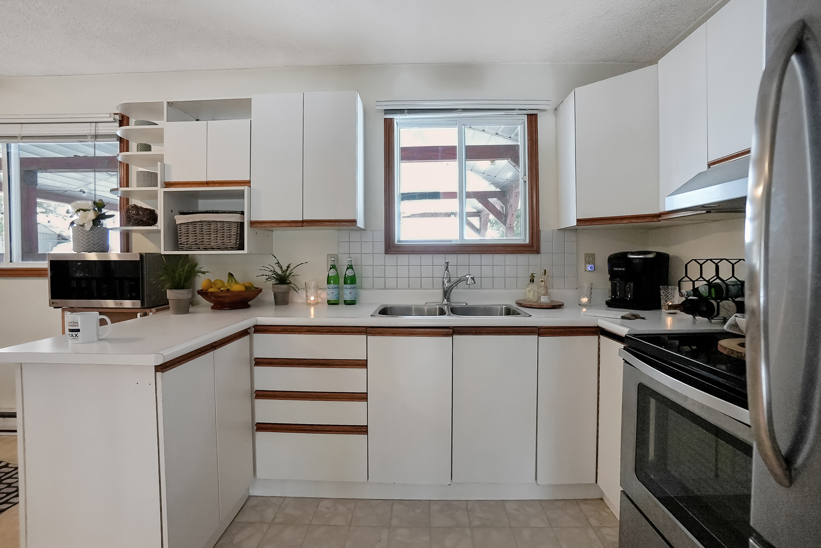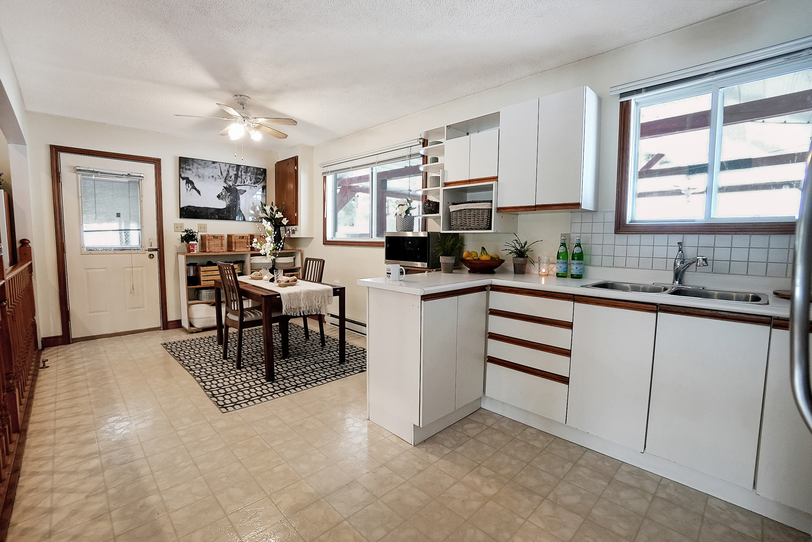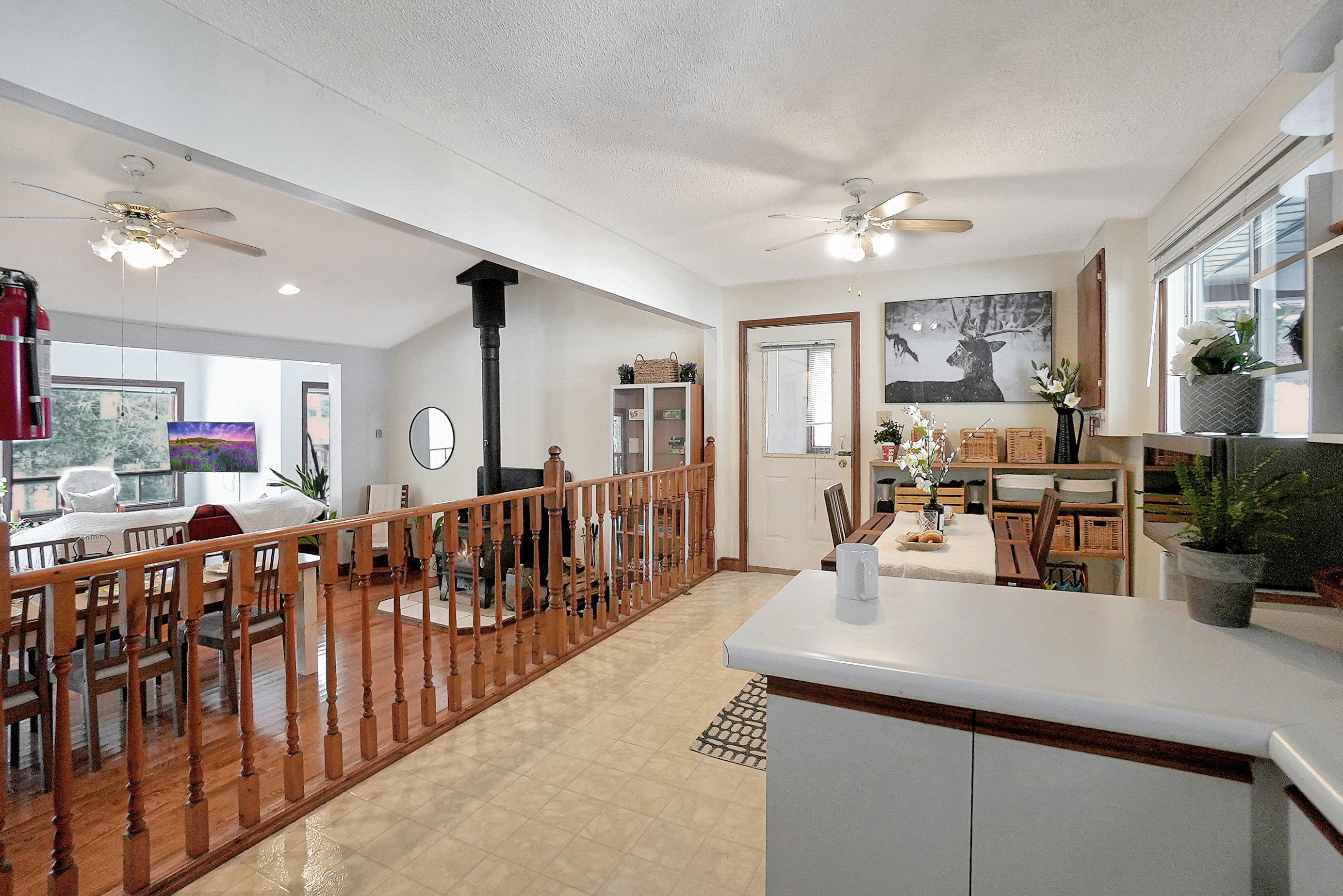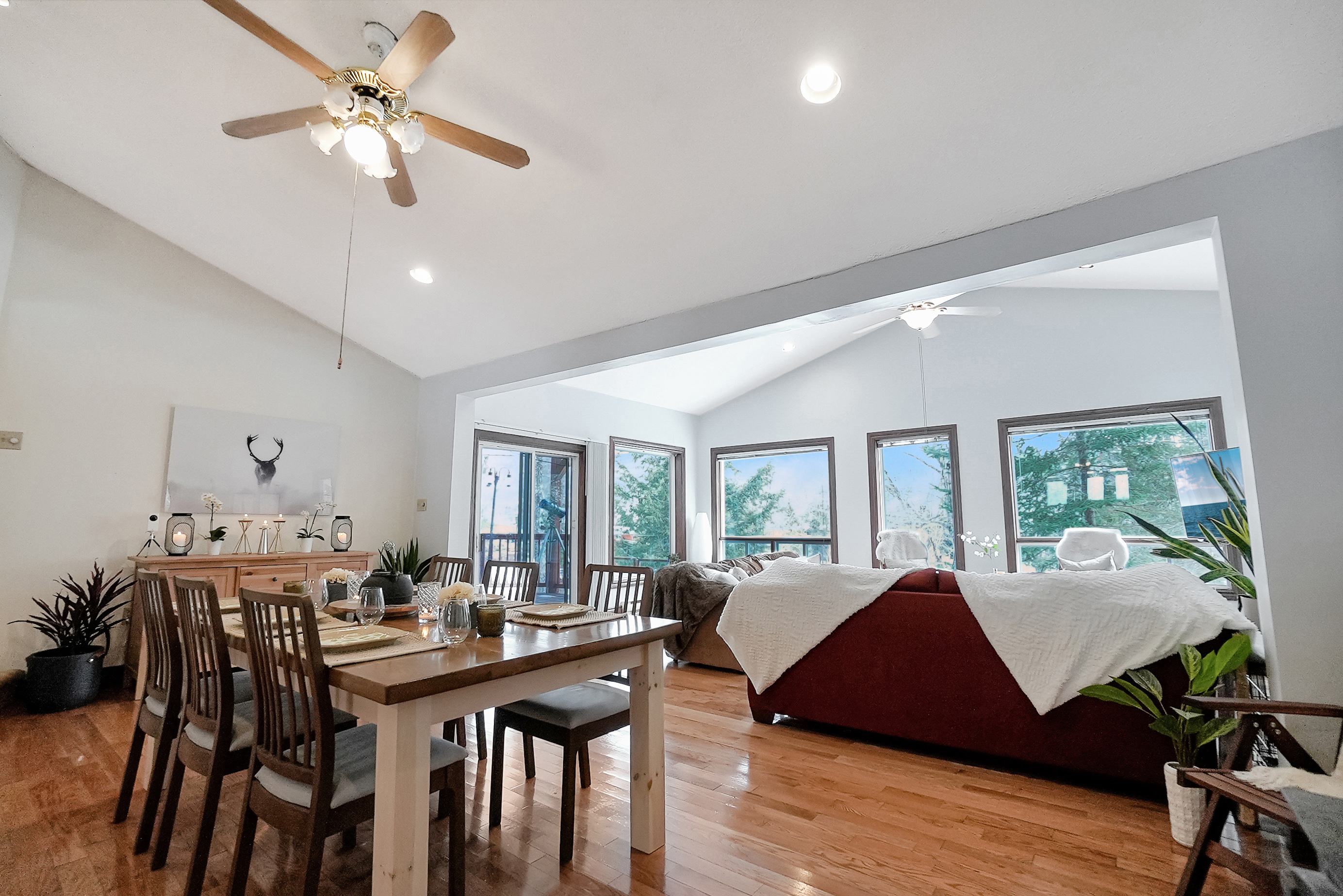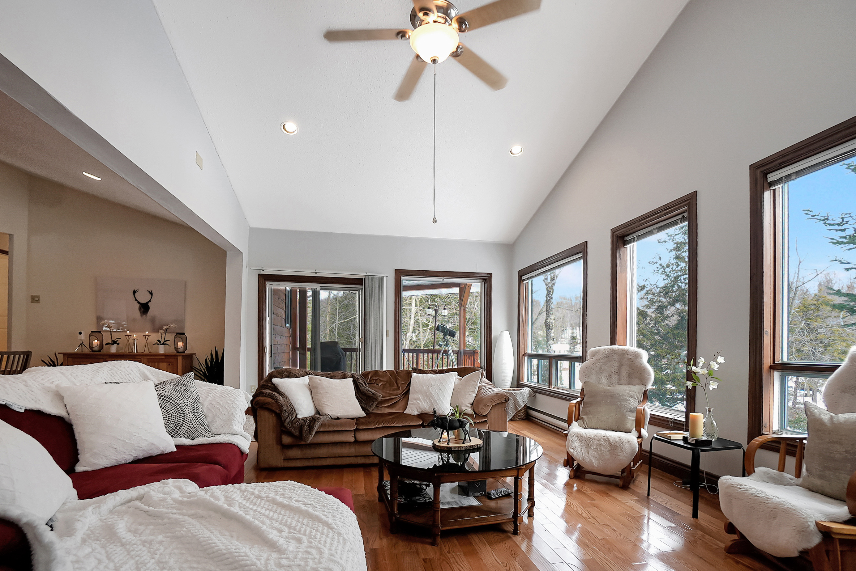 As you step inside, you'll be greeted by a spacious and inviting open concept living room, dining room, and kitchen area. The living room features large windows that provide breathtaking views of the lake, and a cozy wood-burning fireplace, perfect for chilly evenings. The dining area comfortably seats ten and is ideal for entertaining. The kitchen is fully equipped with modern appliances and ample counter space for preparing meals.