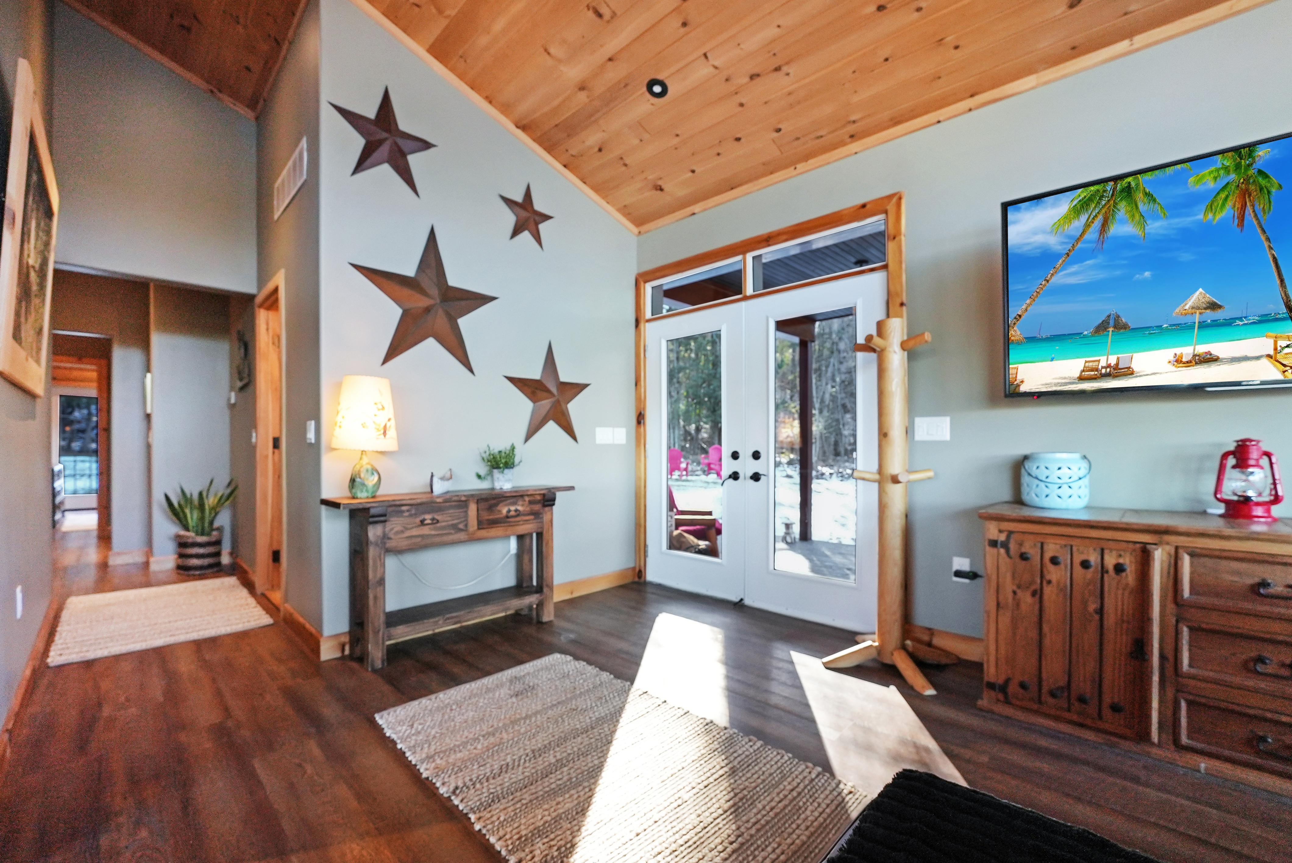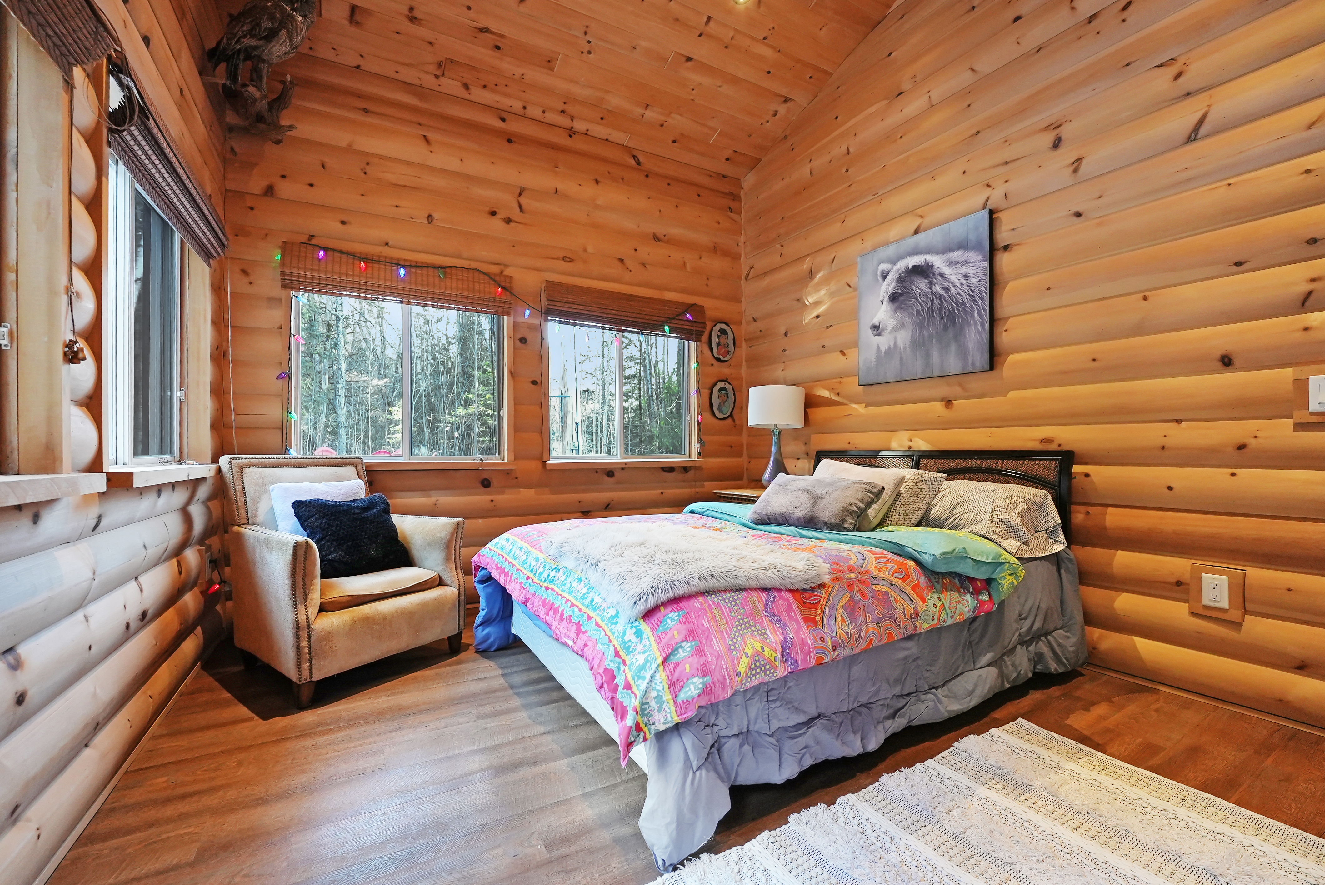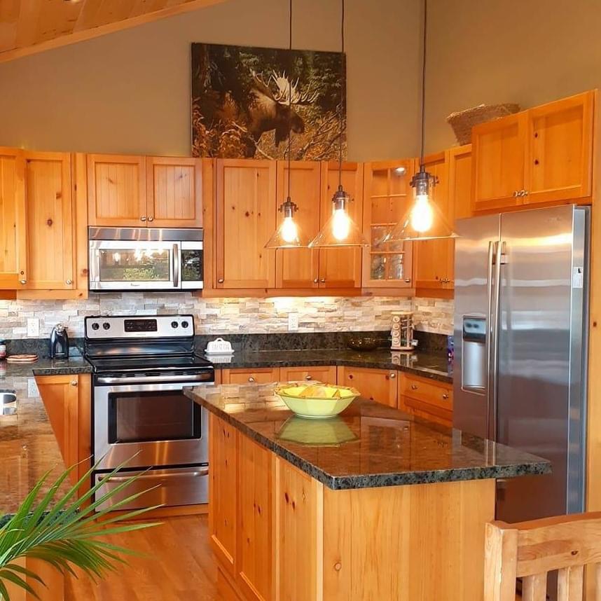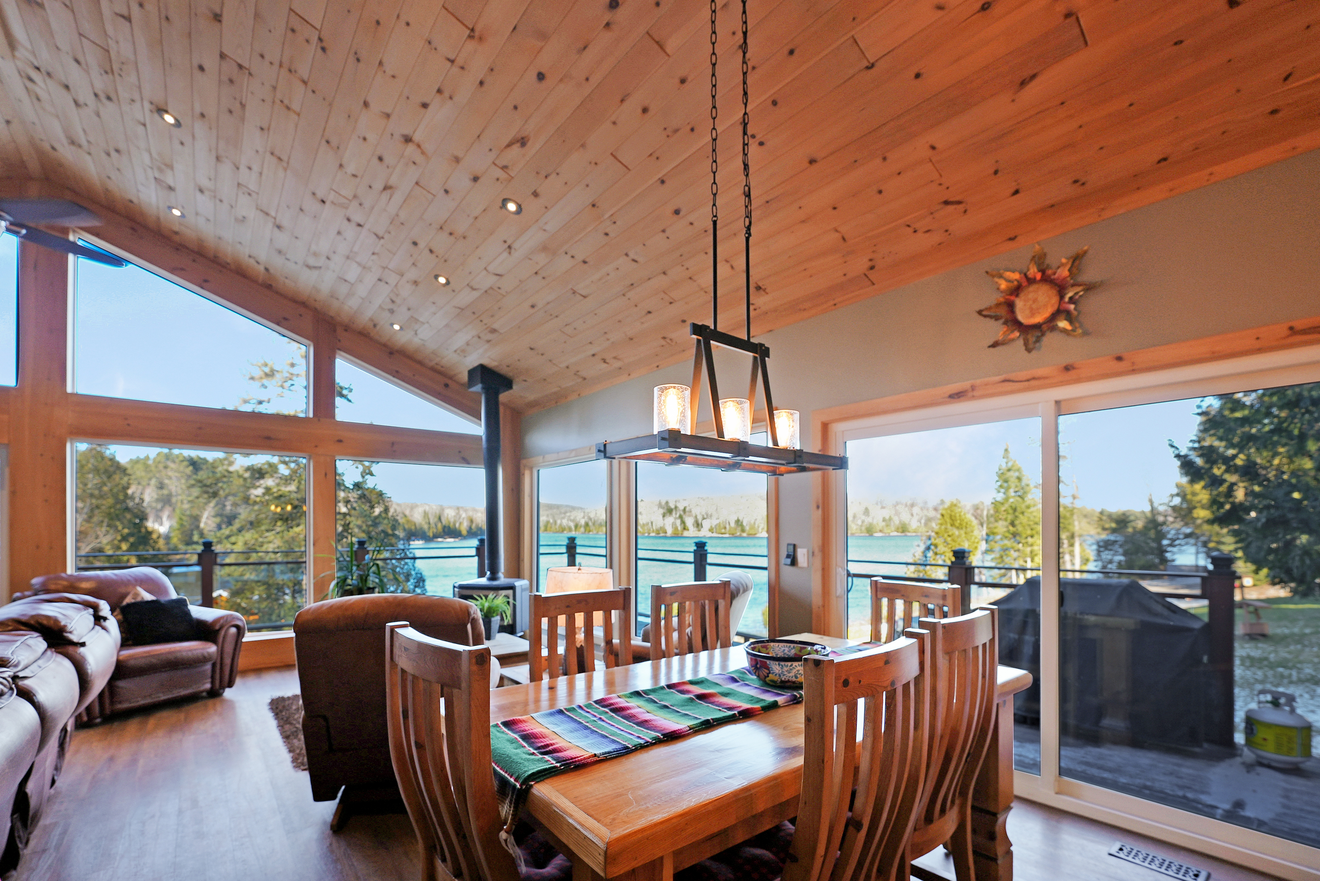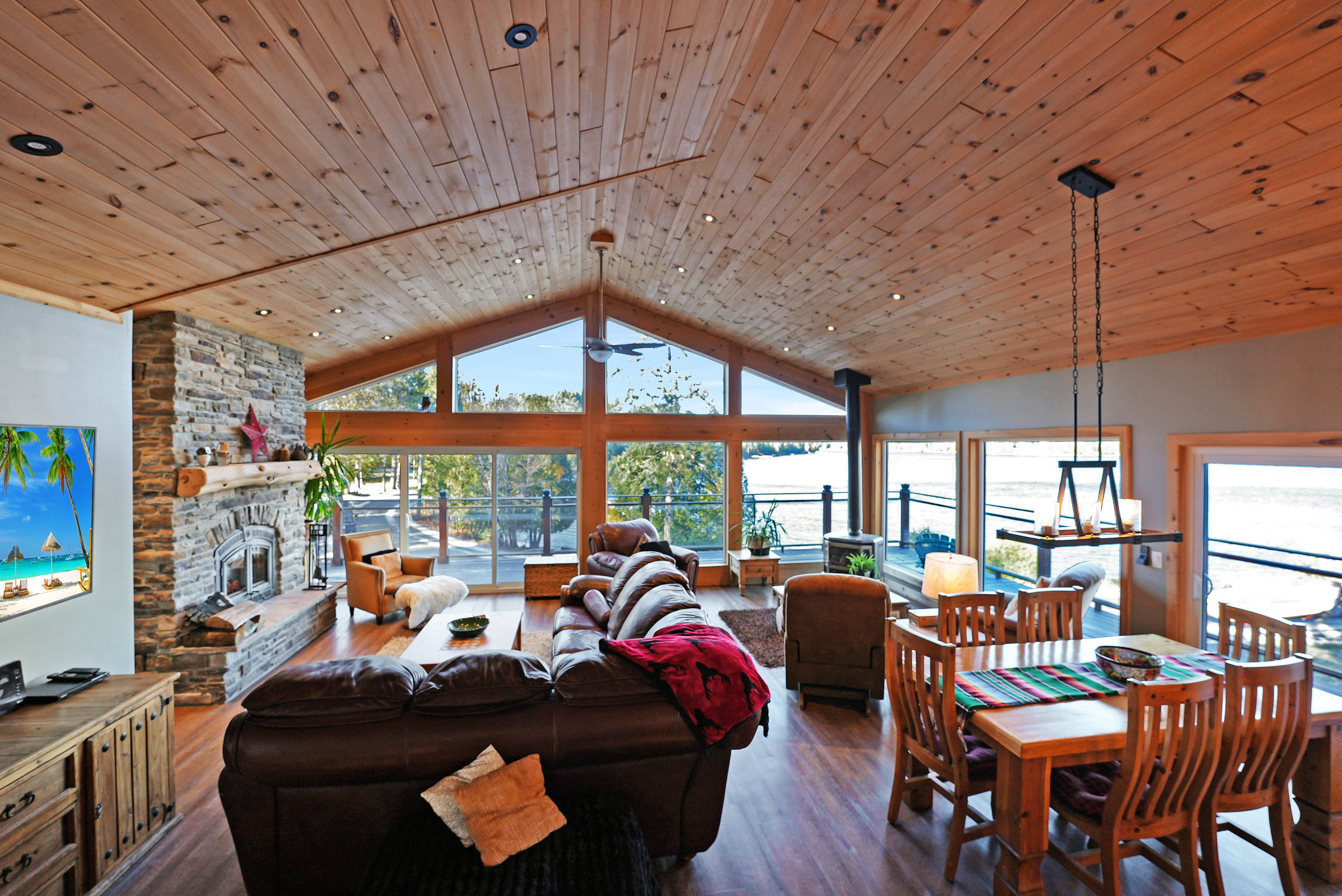 Amazing water views and lakefront living in this charming cottage boasting rustic elegance. With 1800 sq feet, 3 bedrooms, and 2 bathrooms, the open concept kitchen, dining, and living area, adorned with 14-foot pine ceilings, creates an inviting space for family gatherings. The stone fireplace and propane fireplaces in the master bedroom and living room add warmth and character.