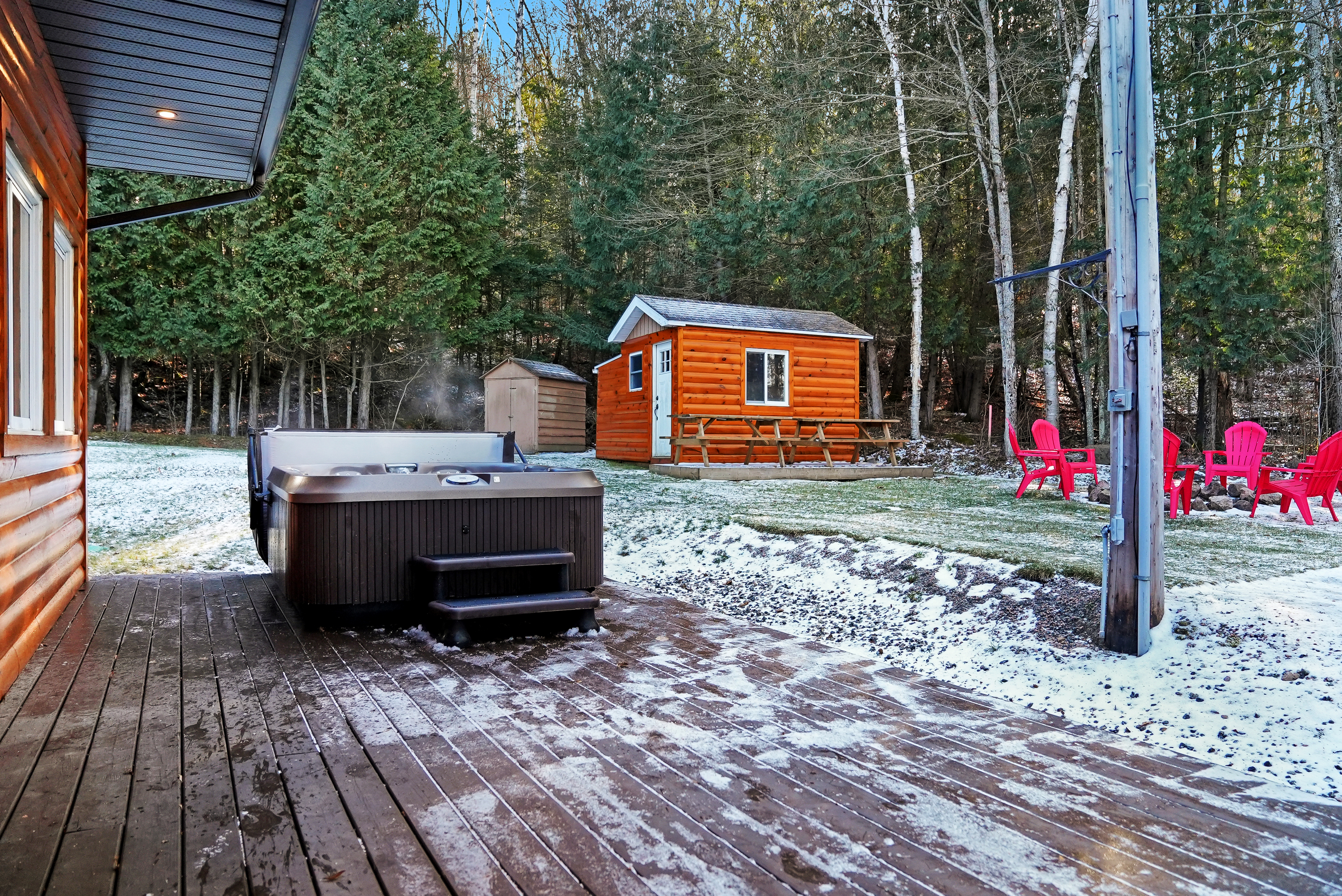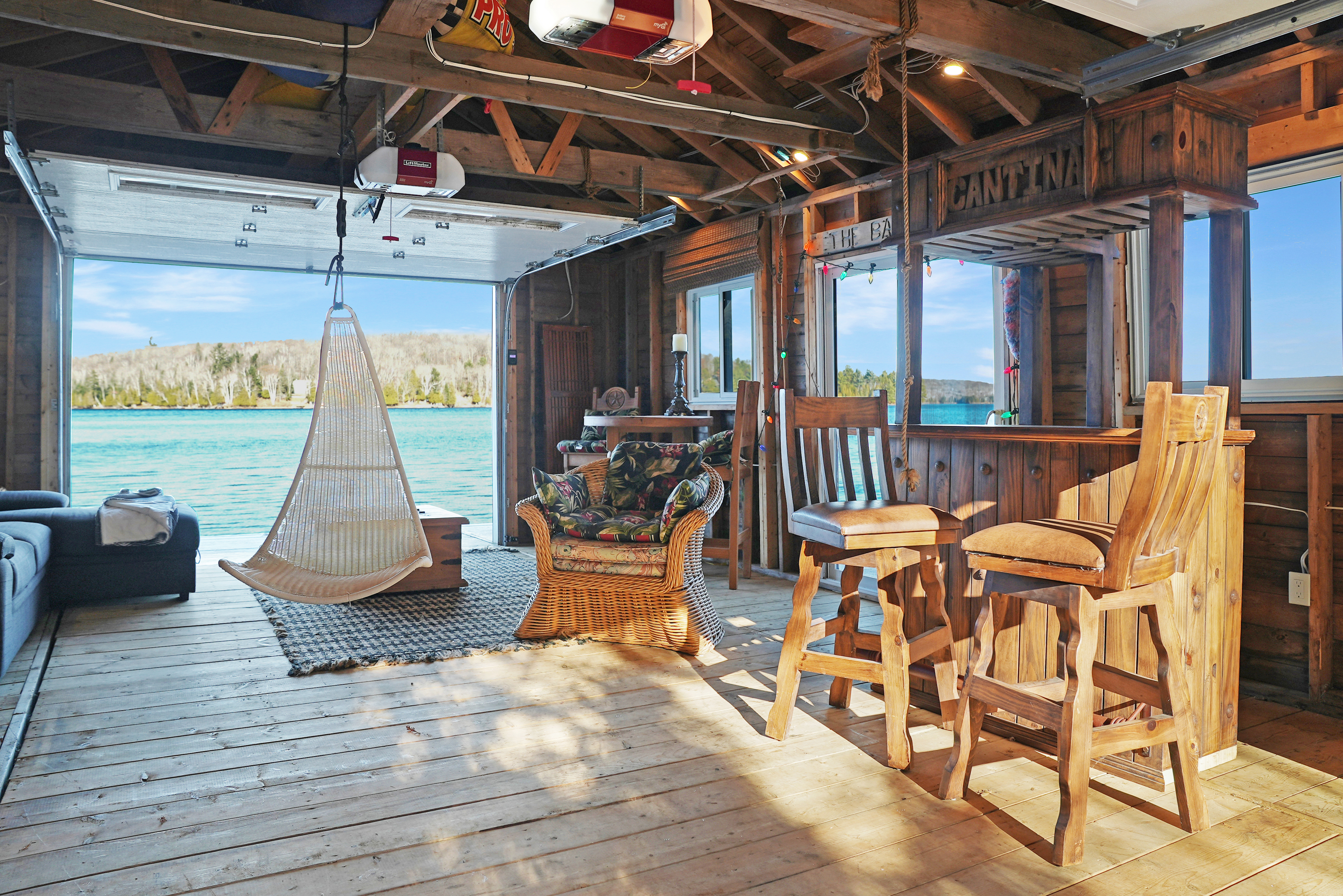 This cottage sits on a 5-lake chain, offering 30 miles of boating, excellent swimming, and water sports. Indulge in lakeside entertainment or easily boat to Haliburton. The refurbished boathouse at the water's edge features a walk-around deck and a removable floor for convenient on-site boat storage, as well as a fantastic area to hang out with friends and family.