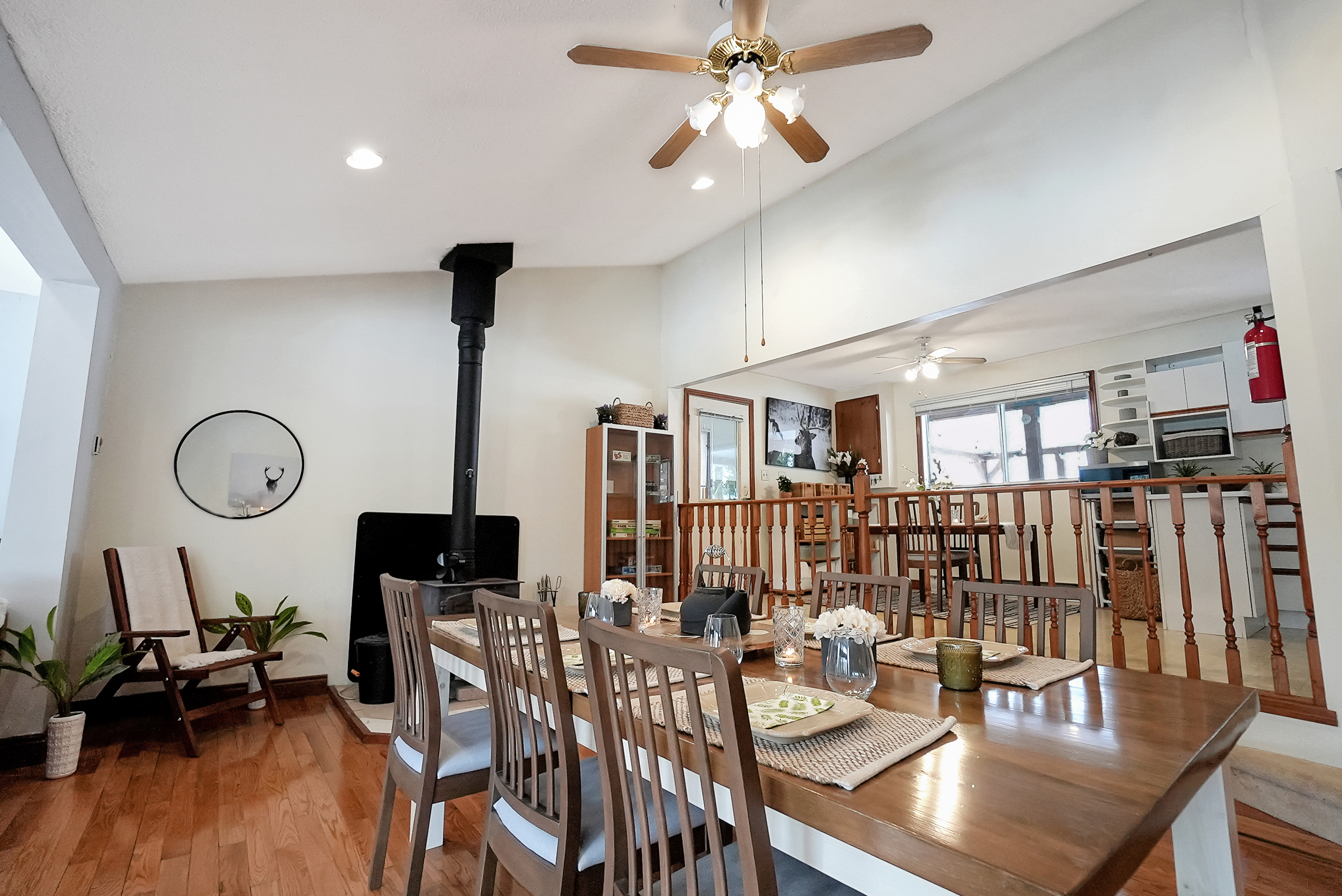As you step inside, you'll be greeted by a spacious and inviting open concept living room, dining room, and kitchen area. The living room features large windows that provide breathtaking views of the lake, and a cozy wood-burning fireplace, perfect for chilly evenings. The dining area comfortably seats ten and is ideal for entertaining. The kitchen is fully equipped with modern appliances and ample counter space for preparing meals.